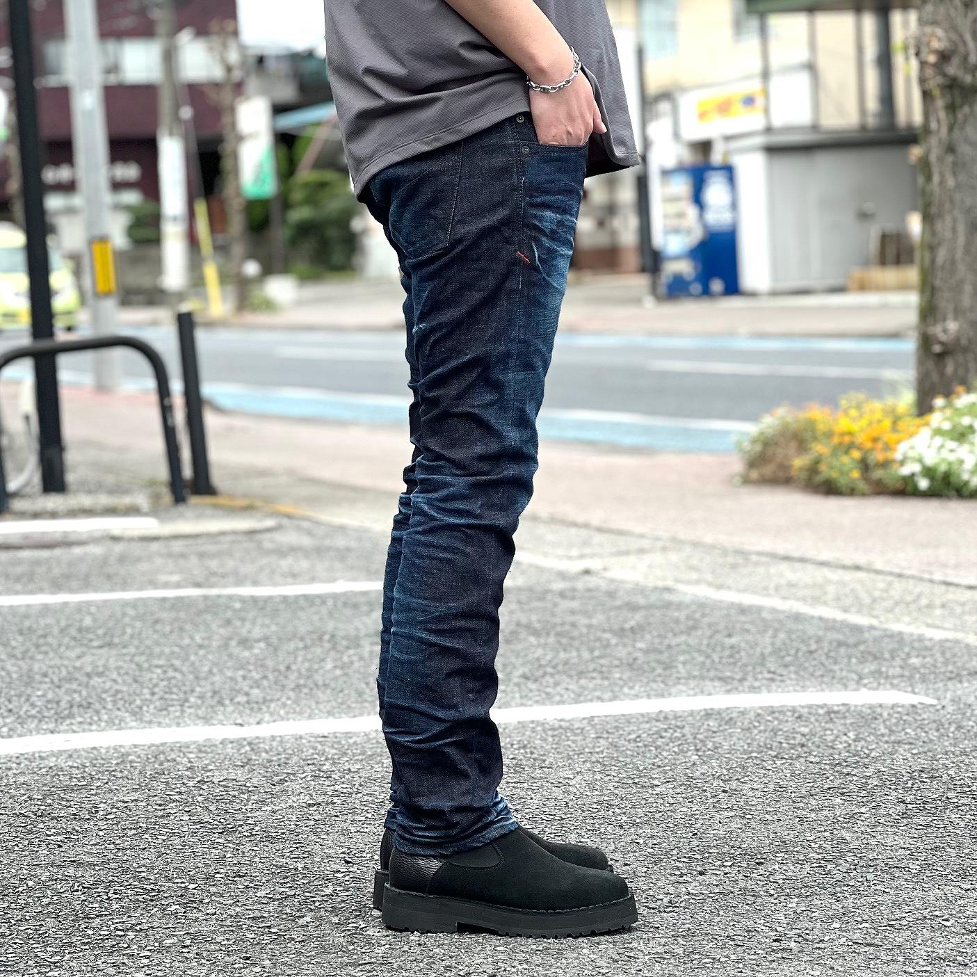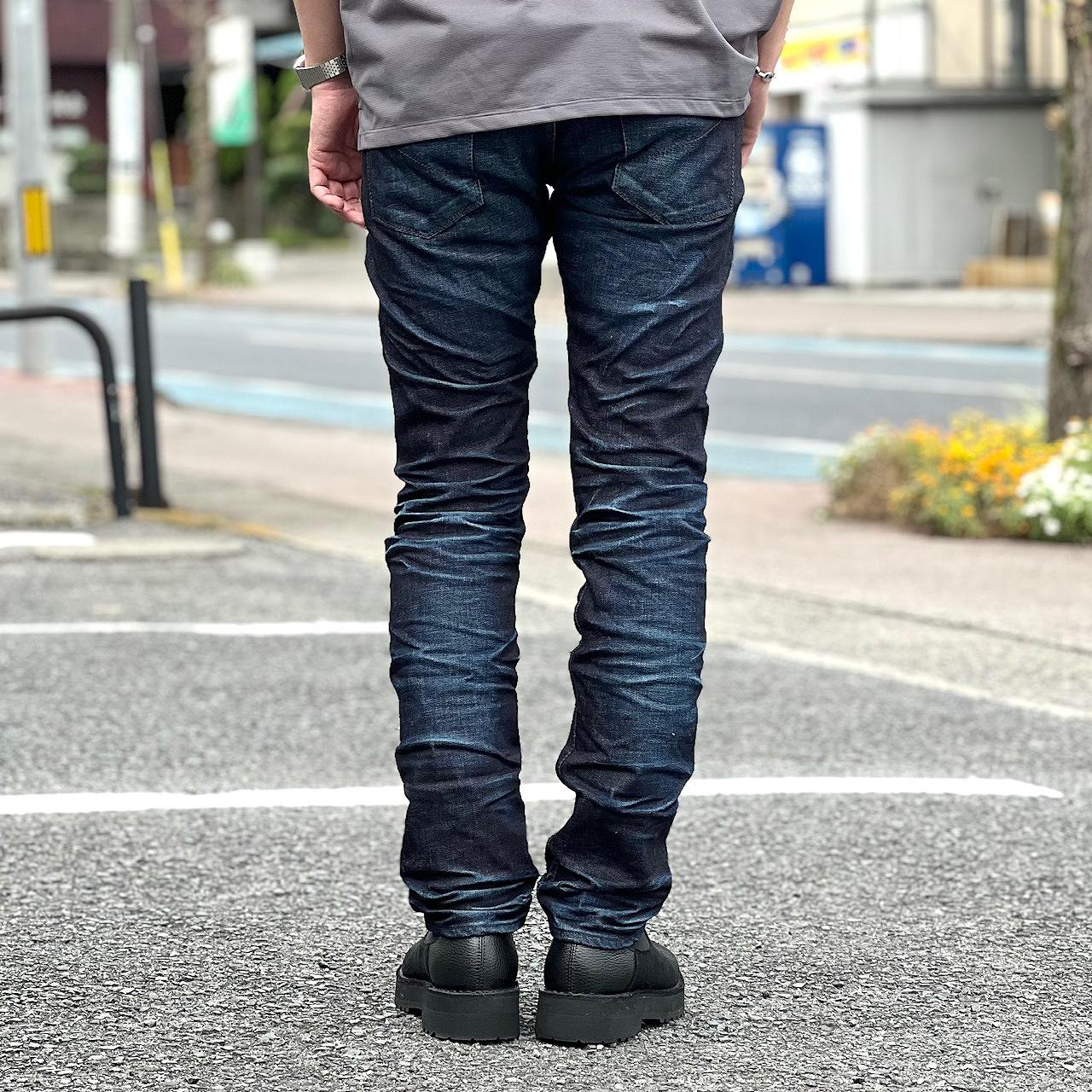DeeTAを代表する加工(RIGID 3D)堅く、糊の有る独特の表情を出す為、糊を残す程度の軽い水通しのみで、ほぼ生のデニム地の上に、職人の手作業で「立体3D」で、ヒゲやシワを表現したモデル。