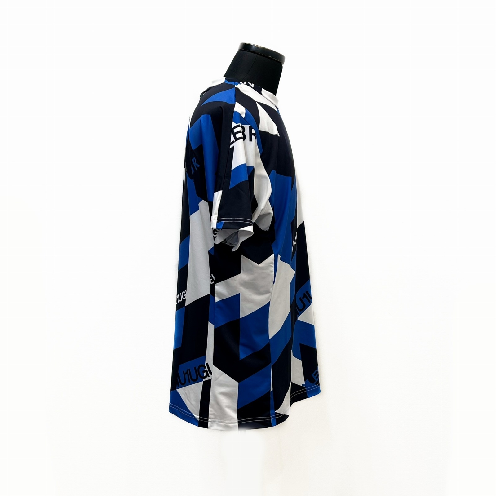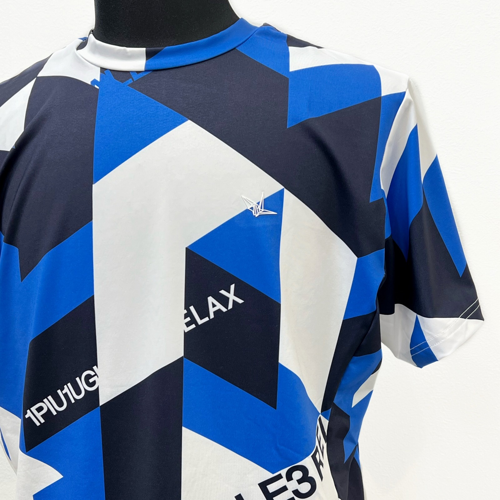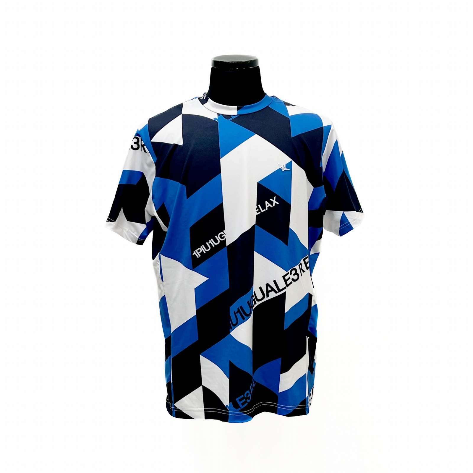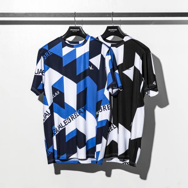 幾何学模様にロゴを配置した目を惹くデザインが海に映える一着。