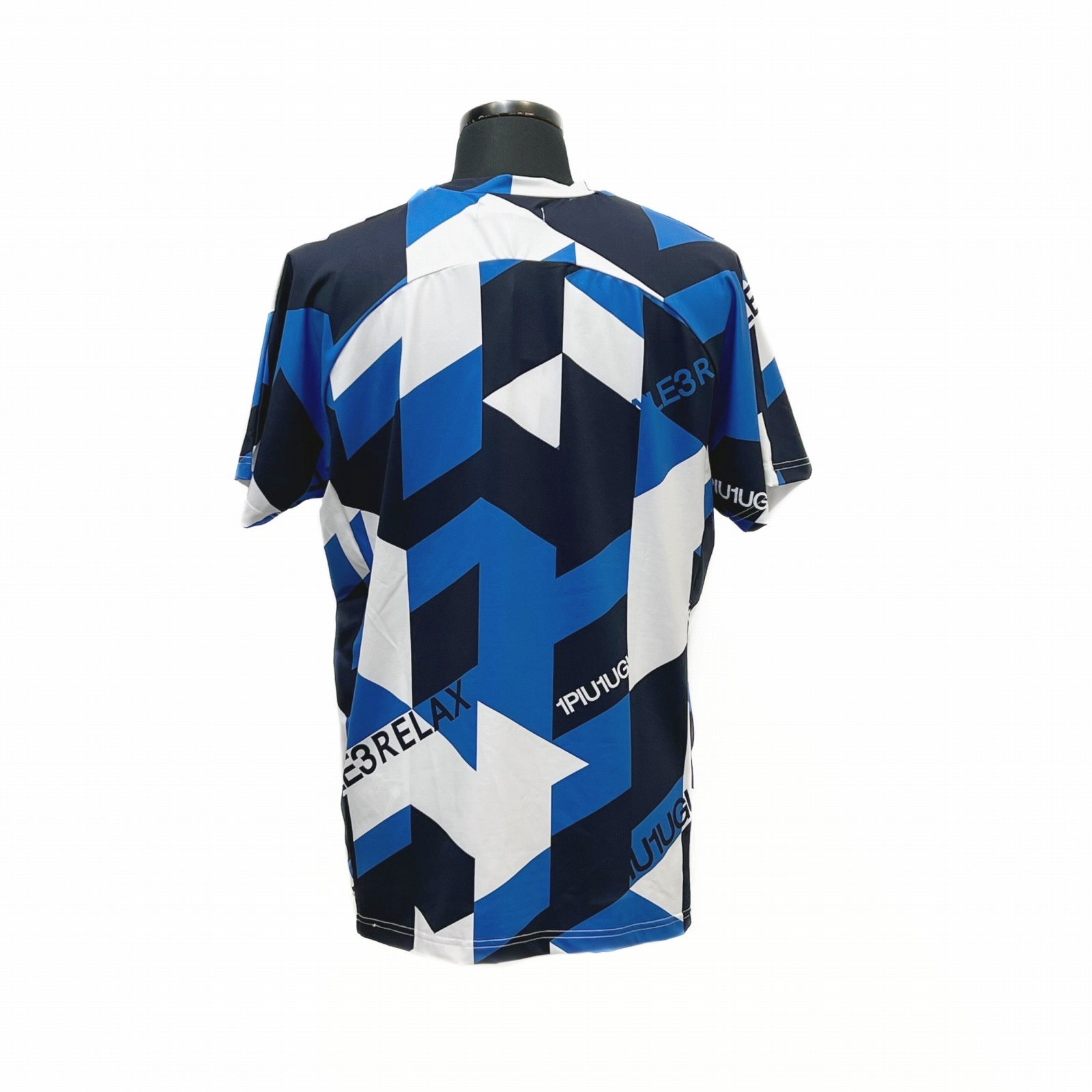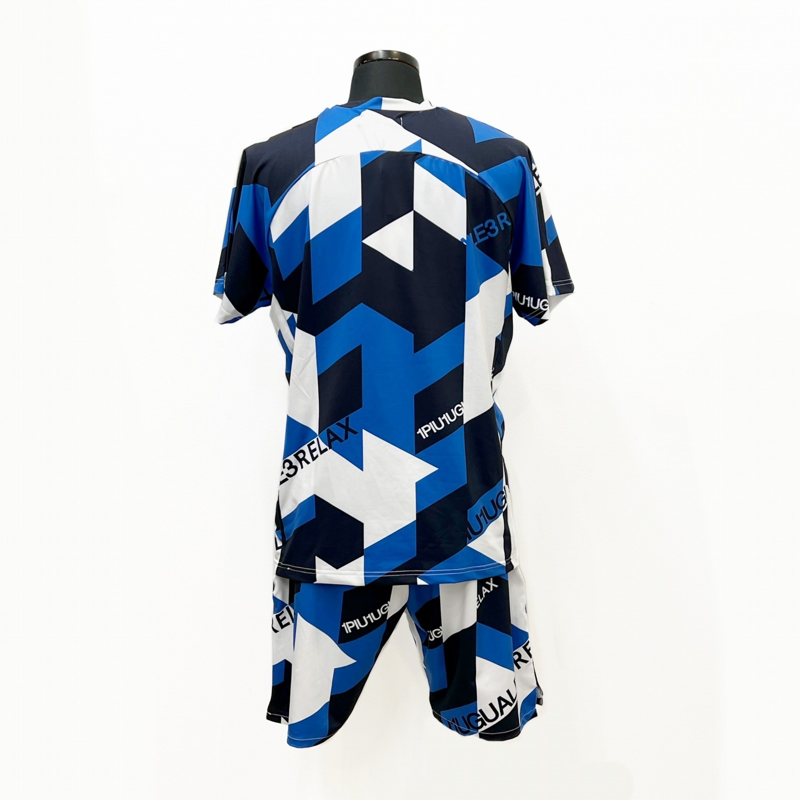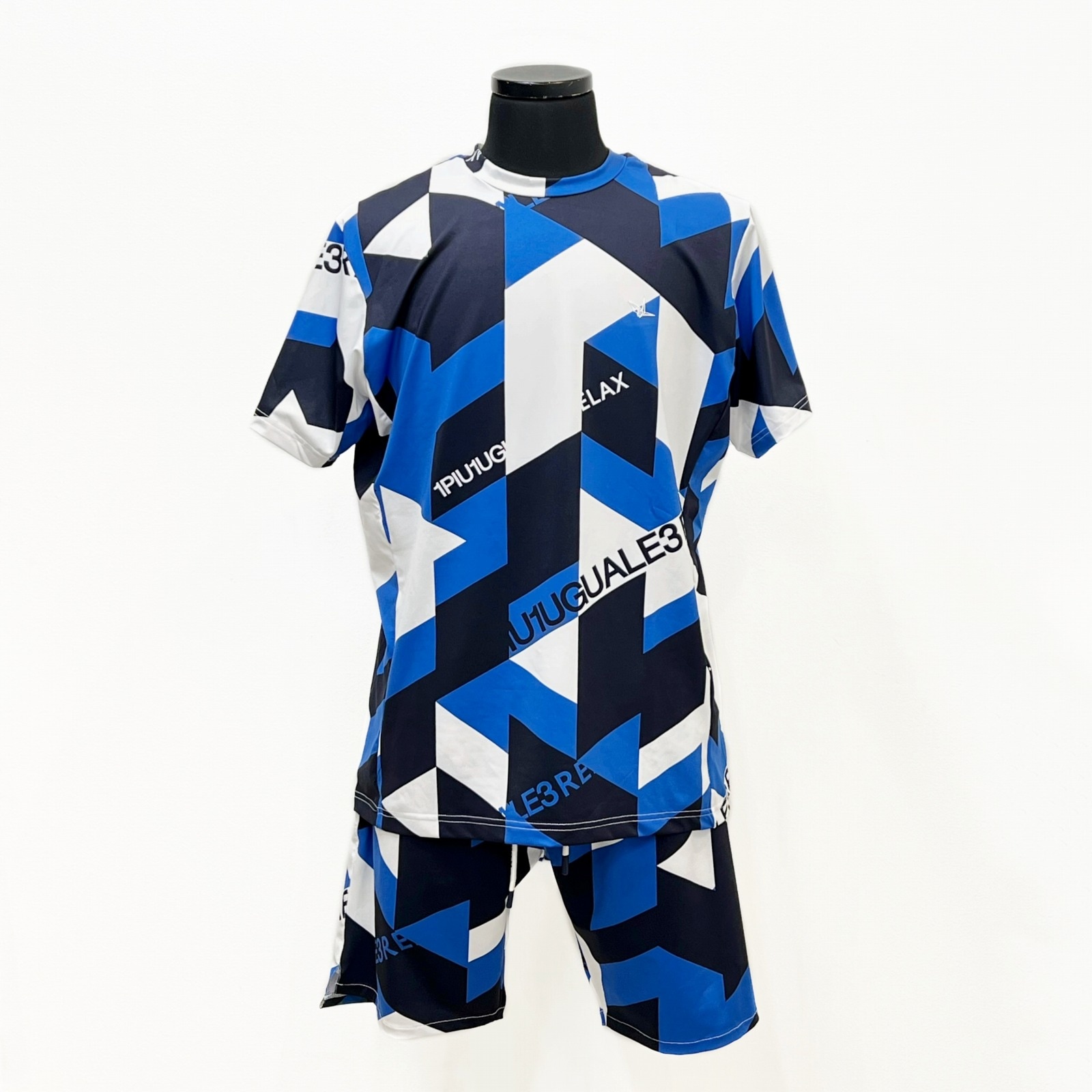 幾何学模様にロゴを配置した目を惹くデザインが海に映える一着。
