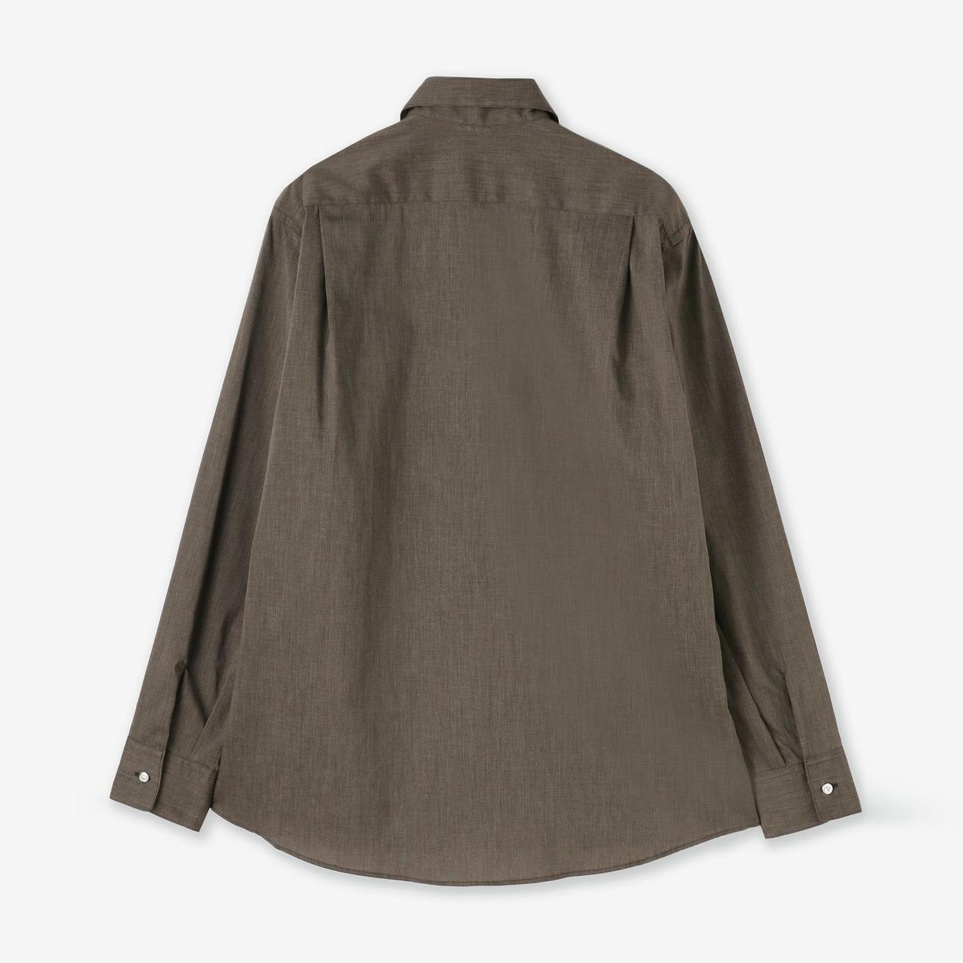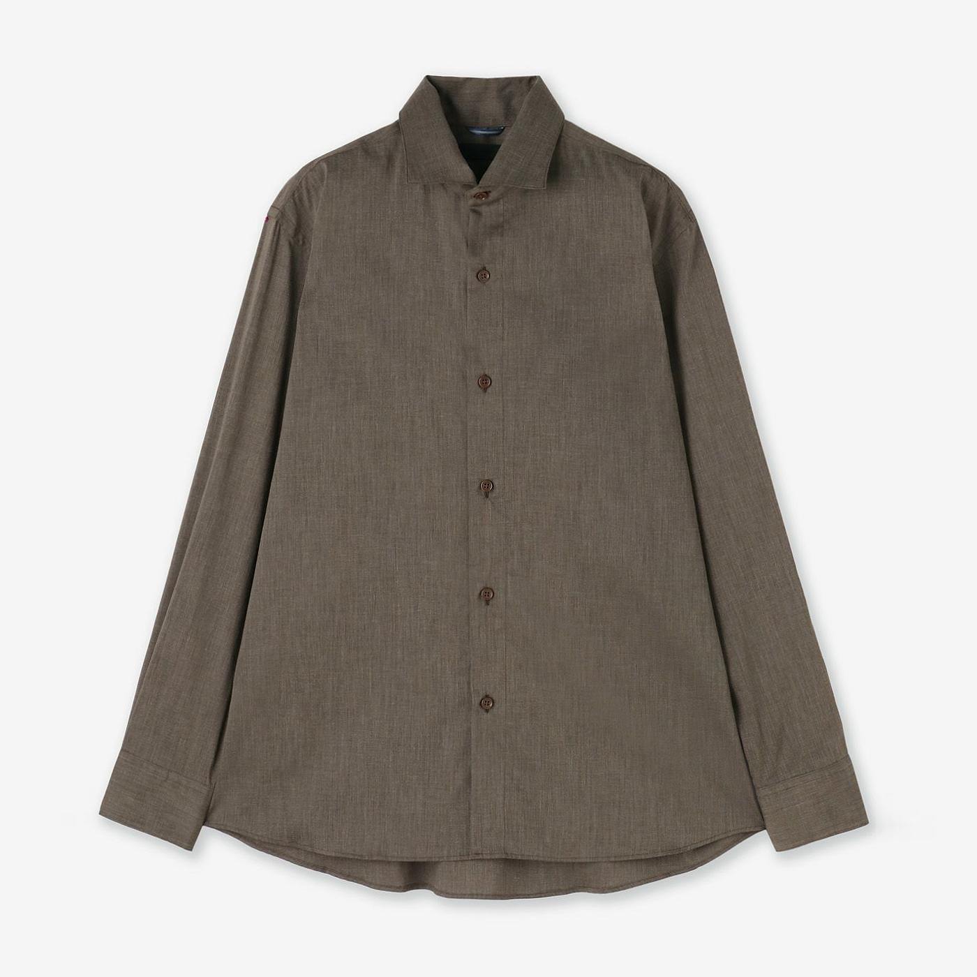 -襟の開きが広いホリゾンタルカラーは、ノーネクタイでも襟元が美しく広がり、シャープさとリラックス感を両立。