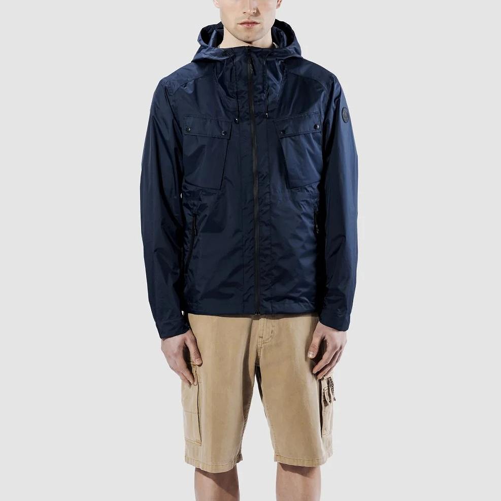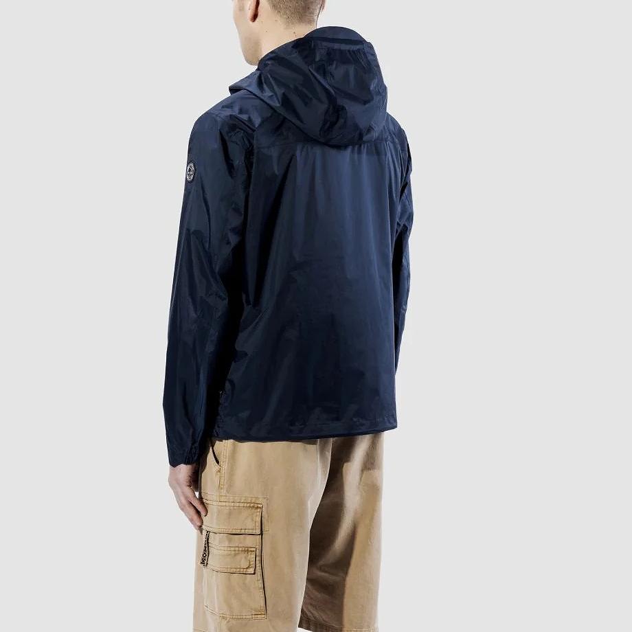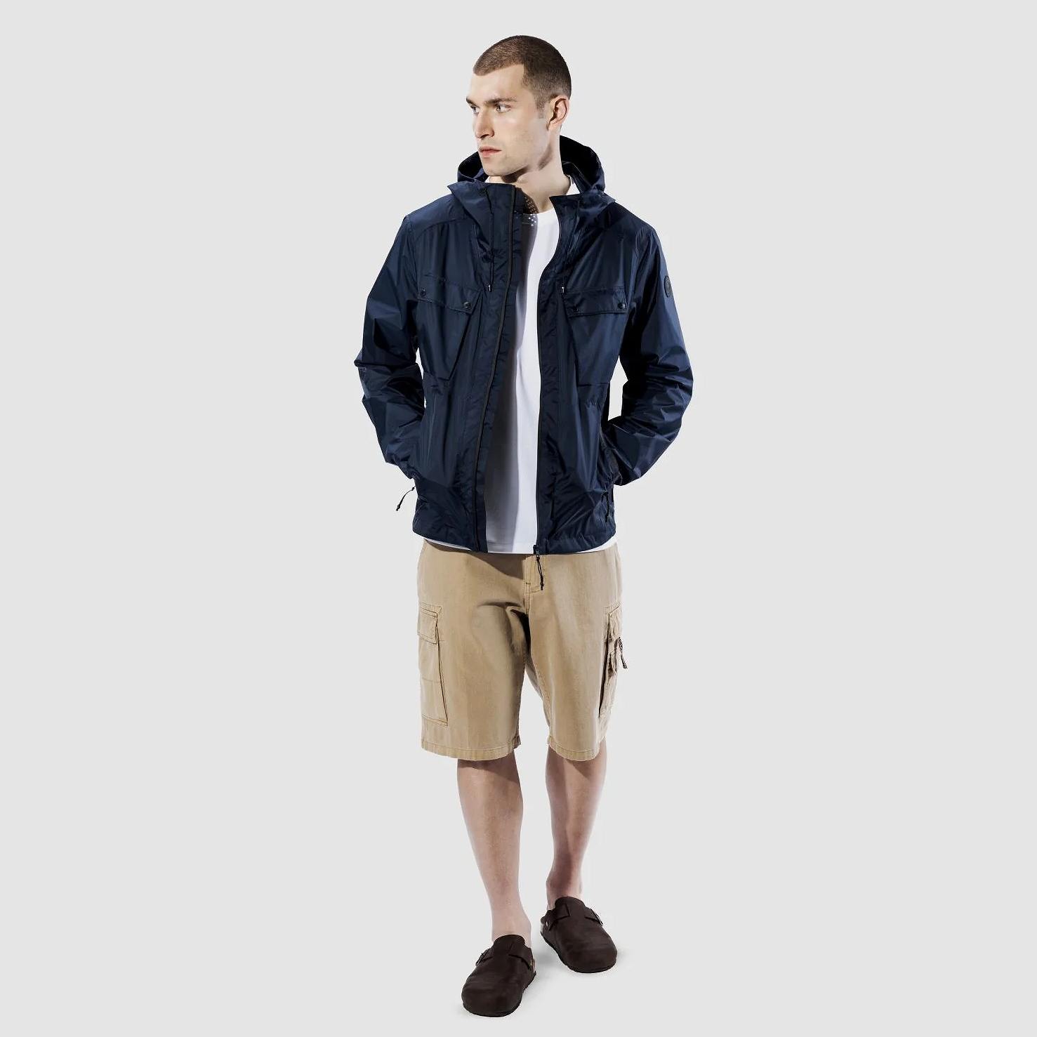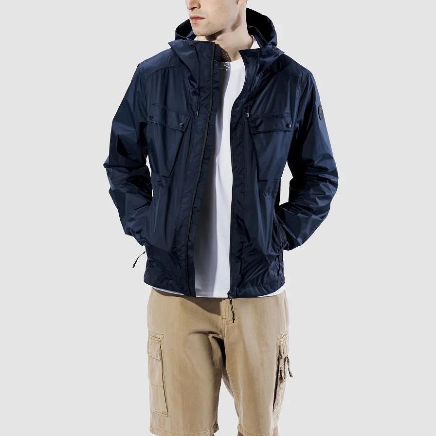 ・伸縮性のあるドローストリングで調節可能なフード付きのメンズ超軽量ジャケット。