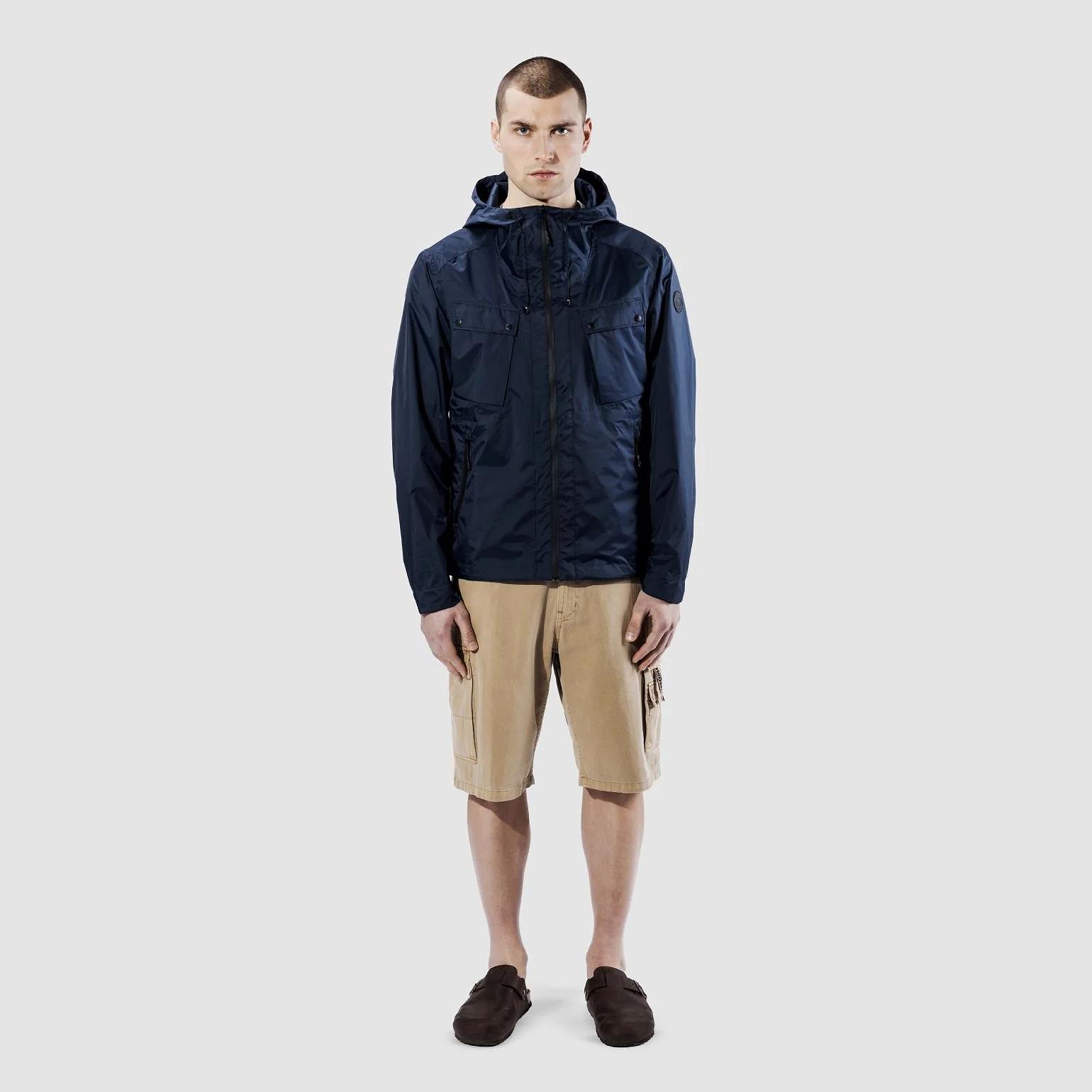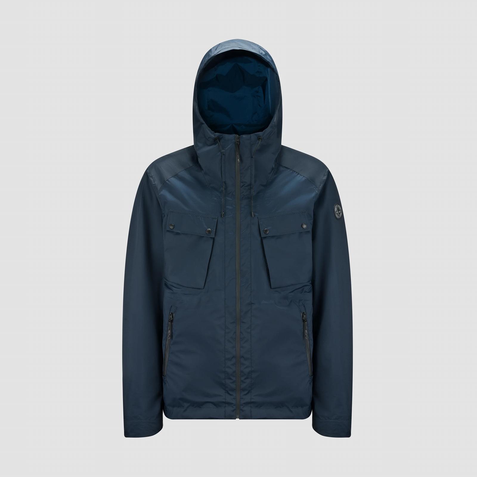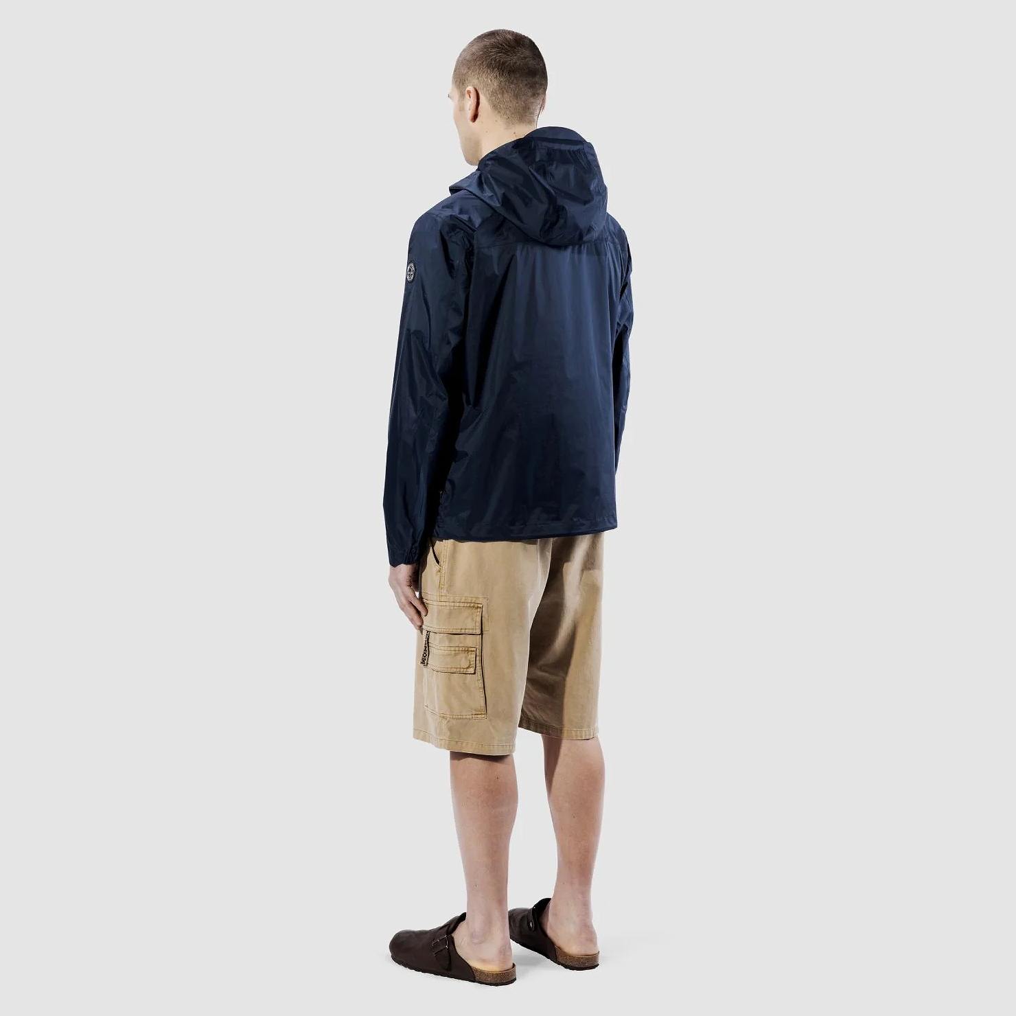 ・伸縮性のあるドローストリングで調節可能なフード付きのメンズ超軽量ジャケット。