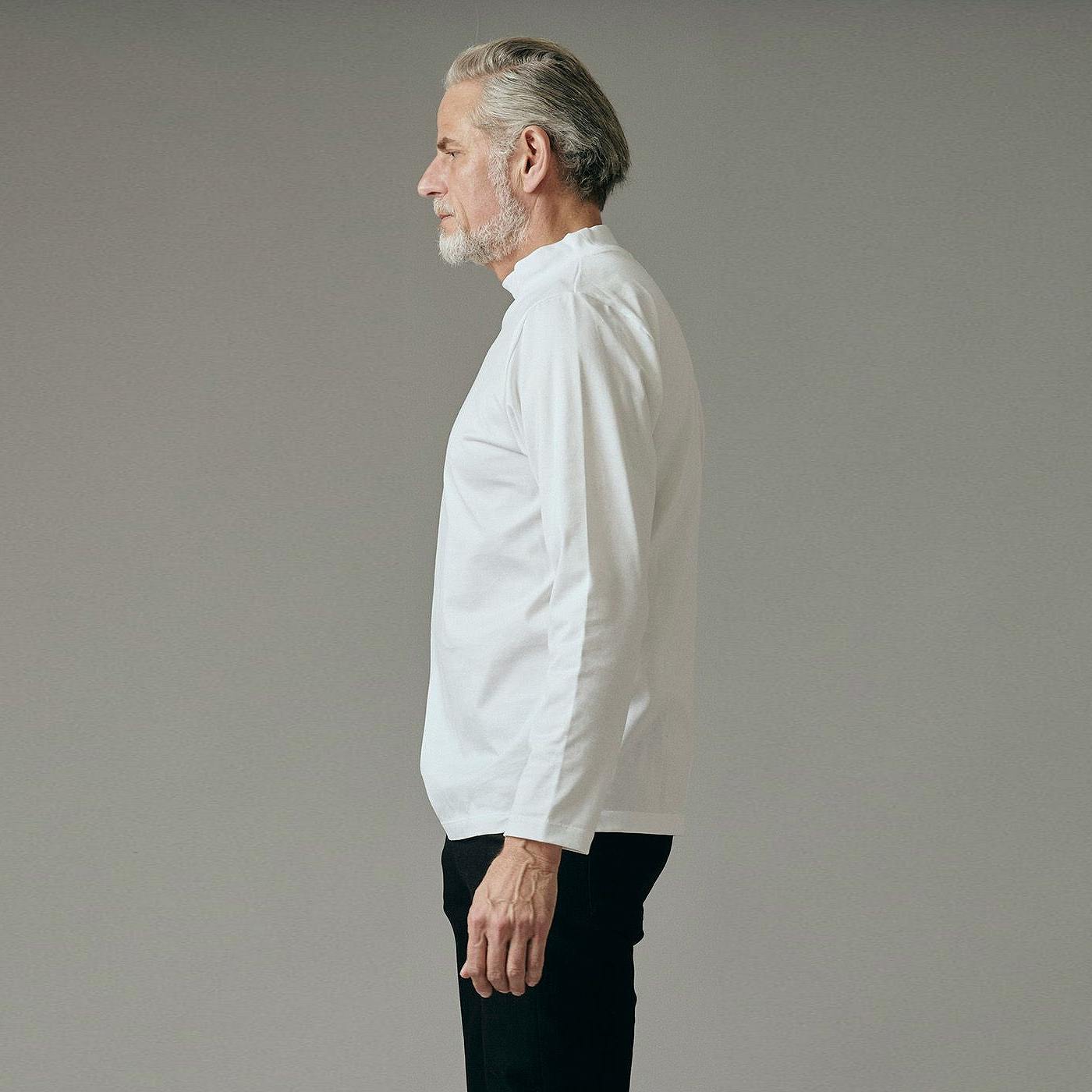 フライス仕様のモックネックが程よく首にフィット。窮屈さを感じさせず、インナーにもメインにも着回せる万能な一枚です。