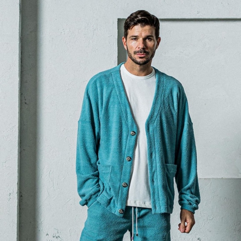 パイル地のティファニーブルー系のカーディガンをメインに初着用。 この色は、青空にも映えますし、着用すると気分も上がります。 上下共に、サイズ感はリラックスシルエットにしています。