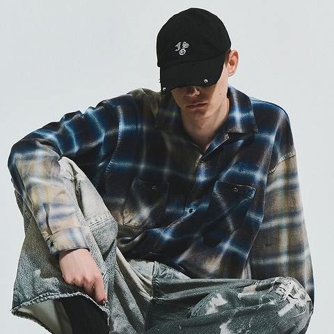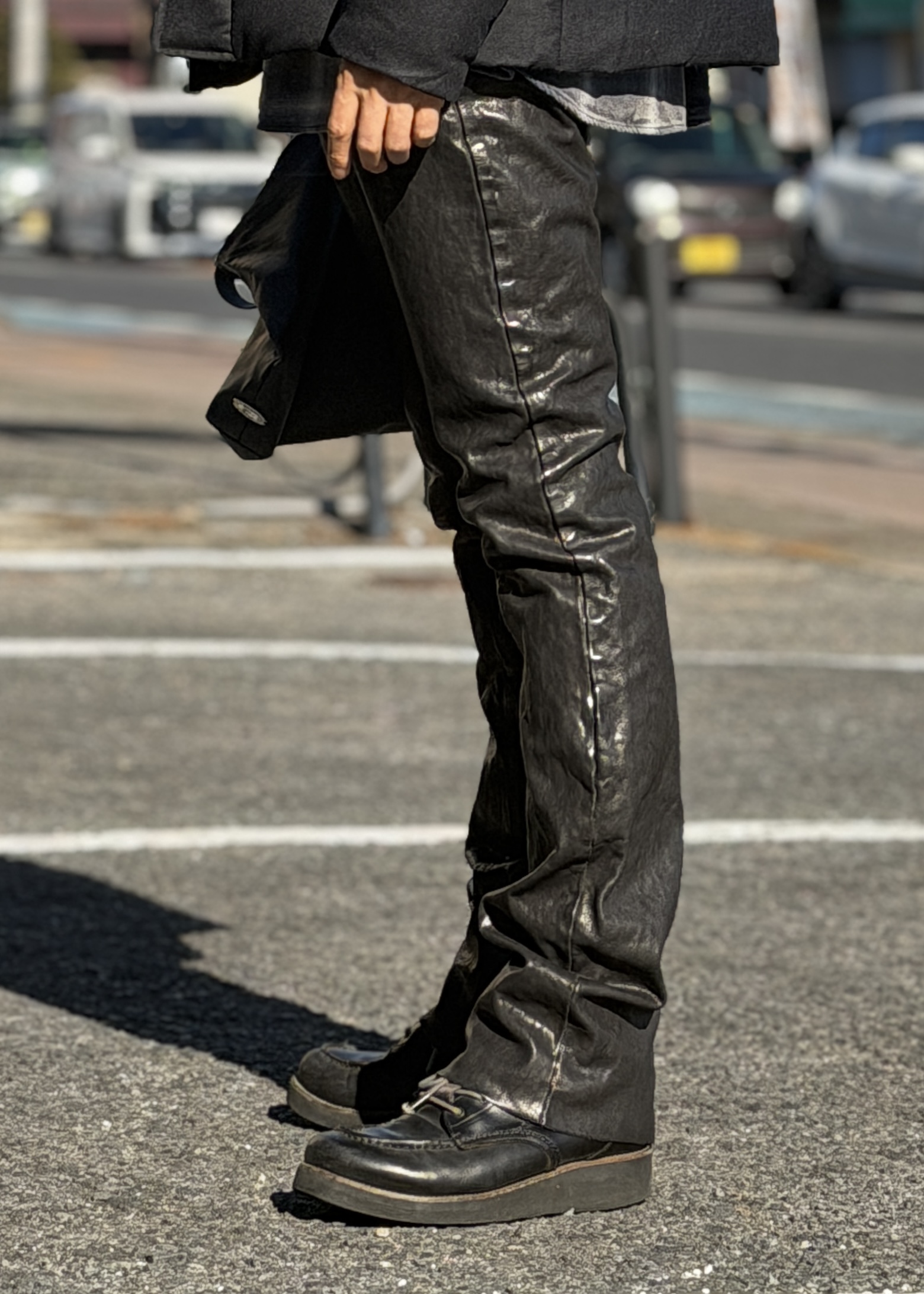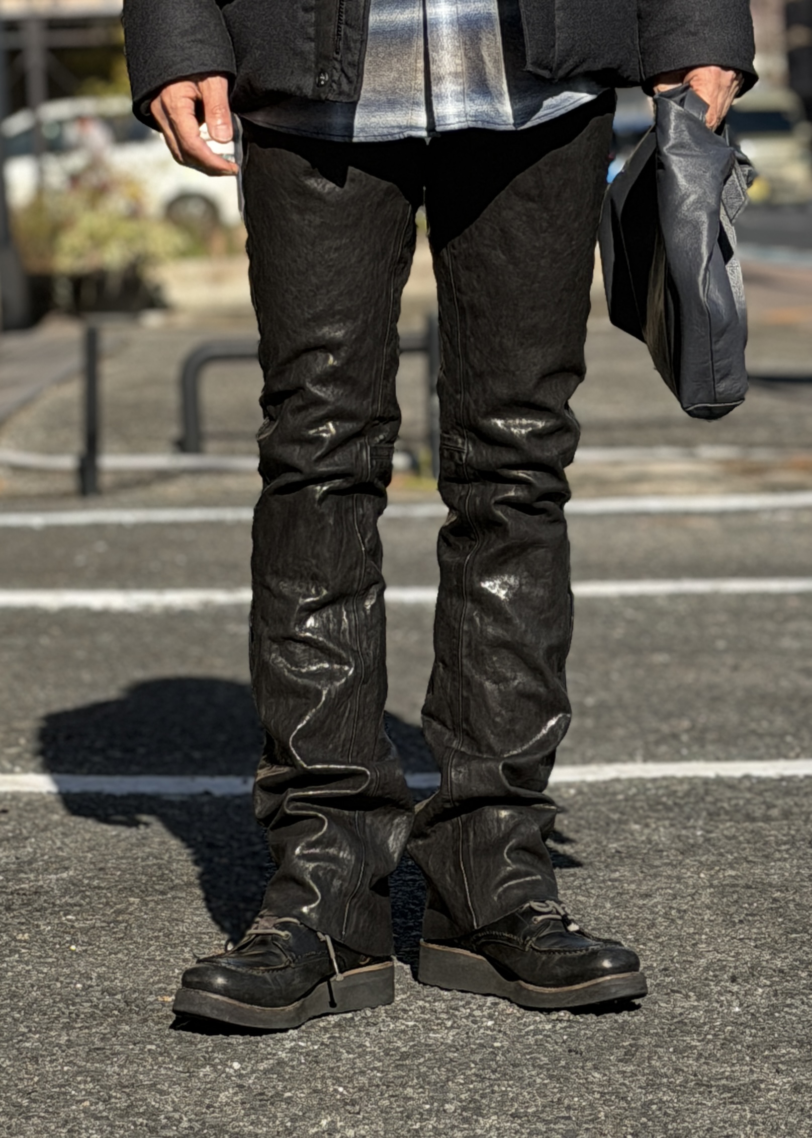 ハードなイメージのレザーパンツに、オンブレチェックシャツ(FORSOMEONE)。