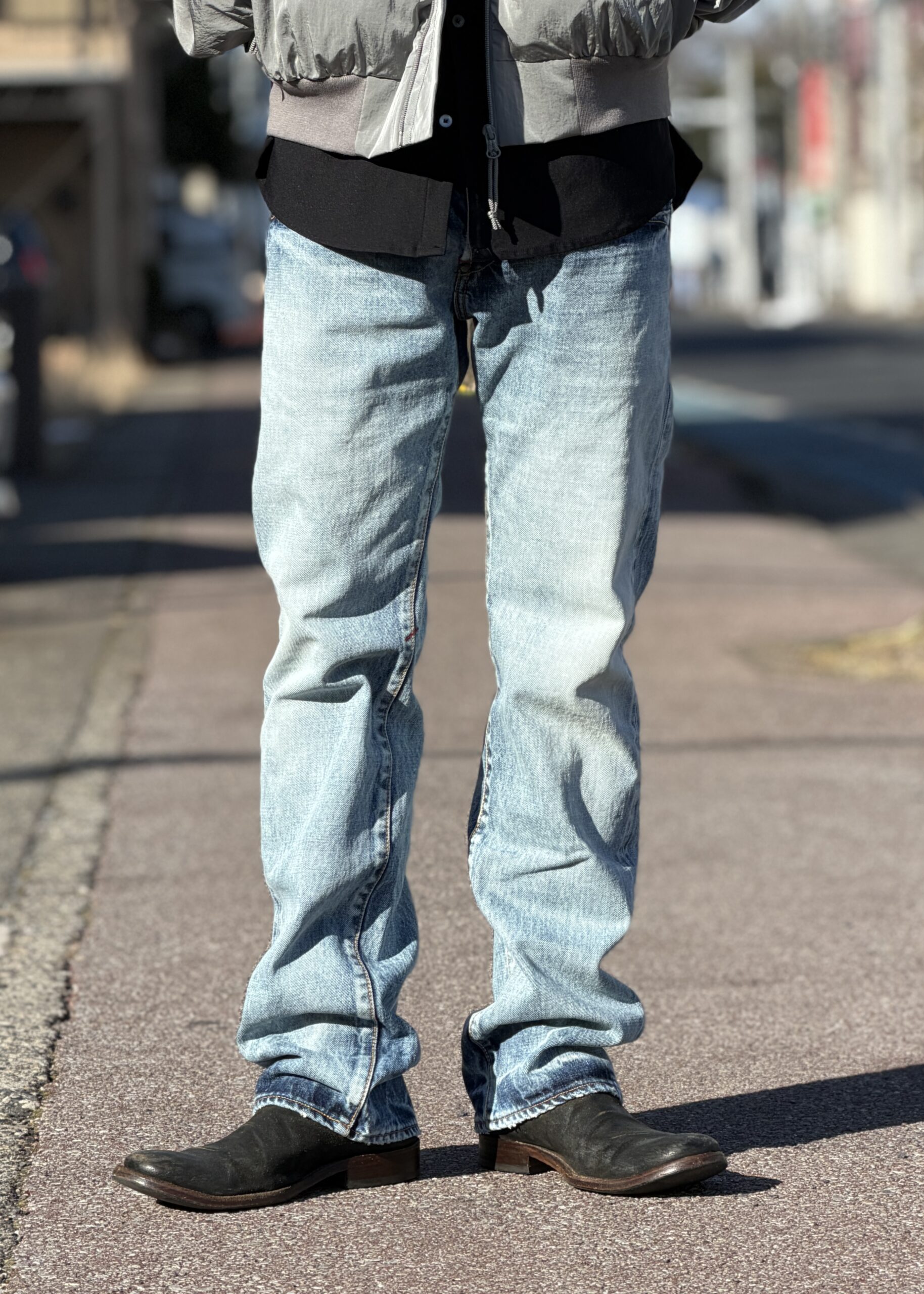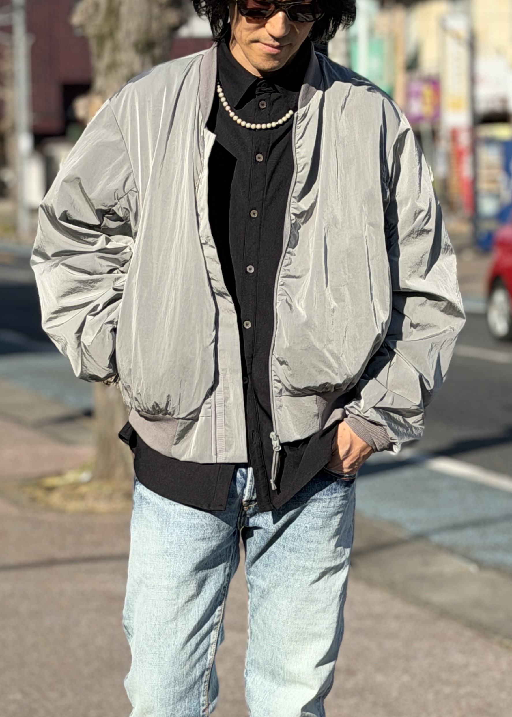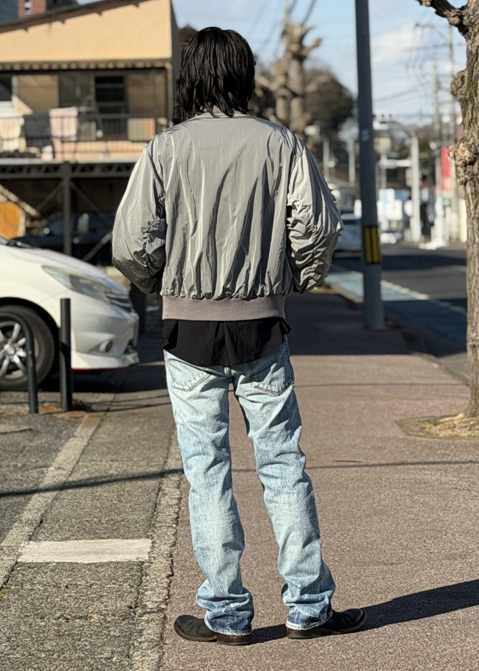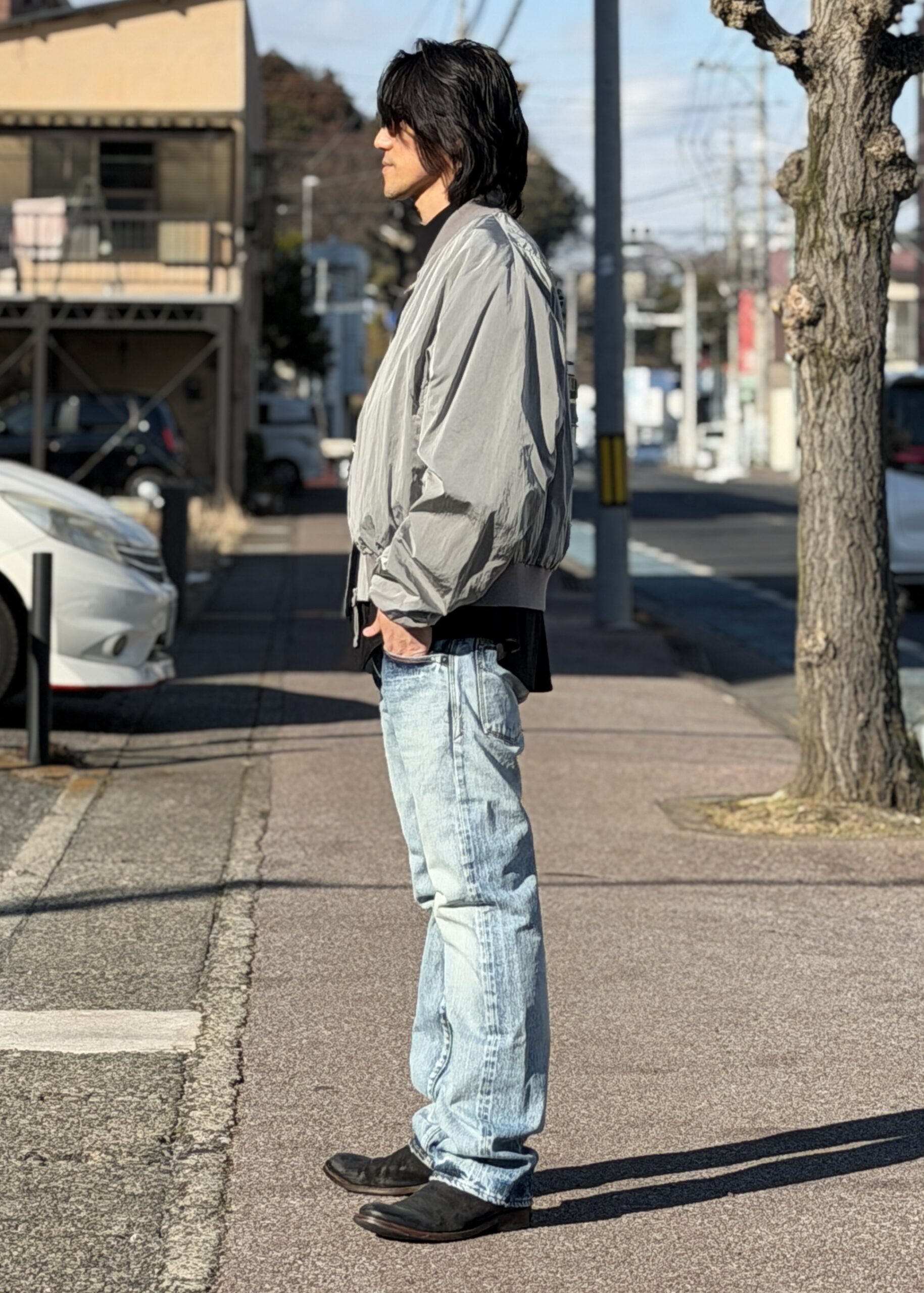 LAD MUSICIANのリモンタナイロンの高品質超軽量MA-1をベースに、DeeTAのマーロンのライトブルーを着用(ノンストレッチのコットン100セルビッチデニムです)。