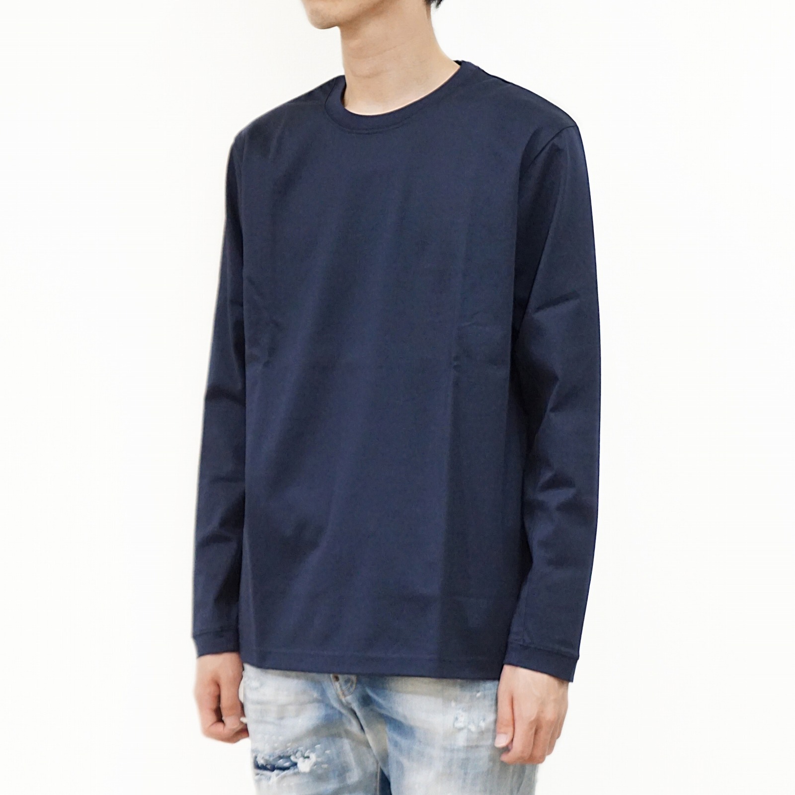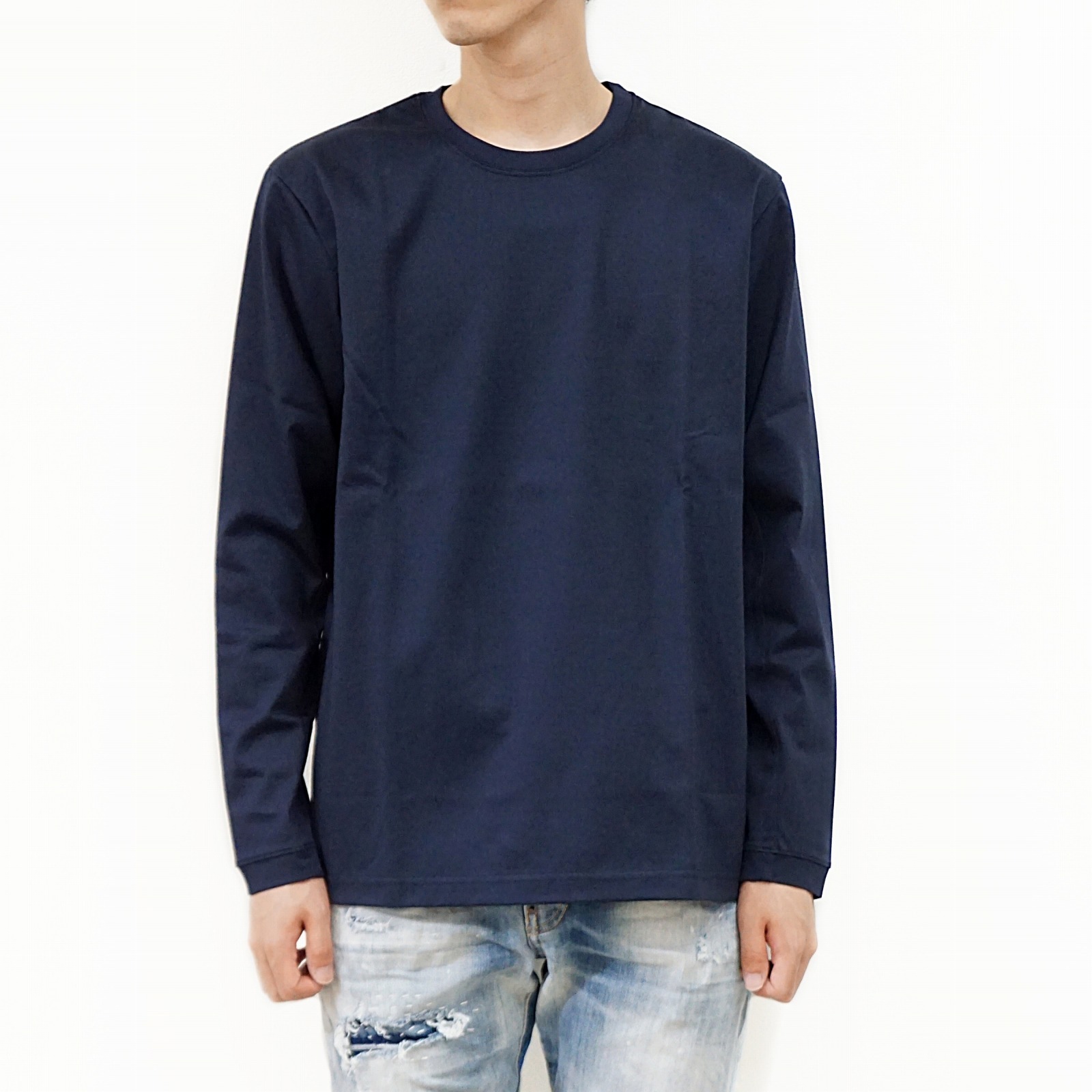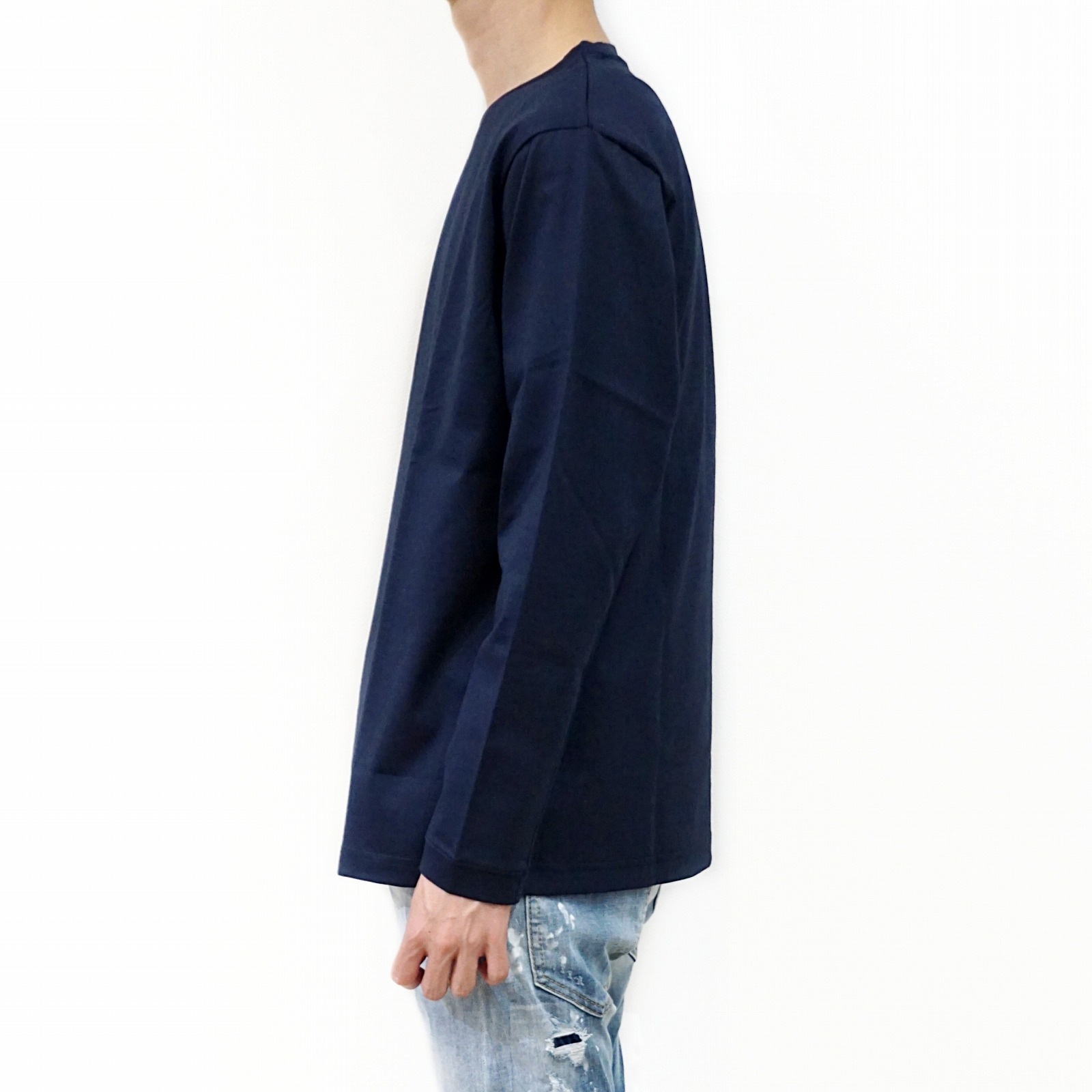 細い番手の糸で通常のカットソーに利用される糸の約3倍の長さを贅沢に使用し、度詰して編み上げられているのでゴリゴリせず、 滑らかな肌触りとハリが特徴的。