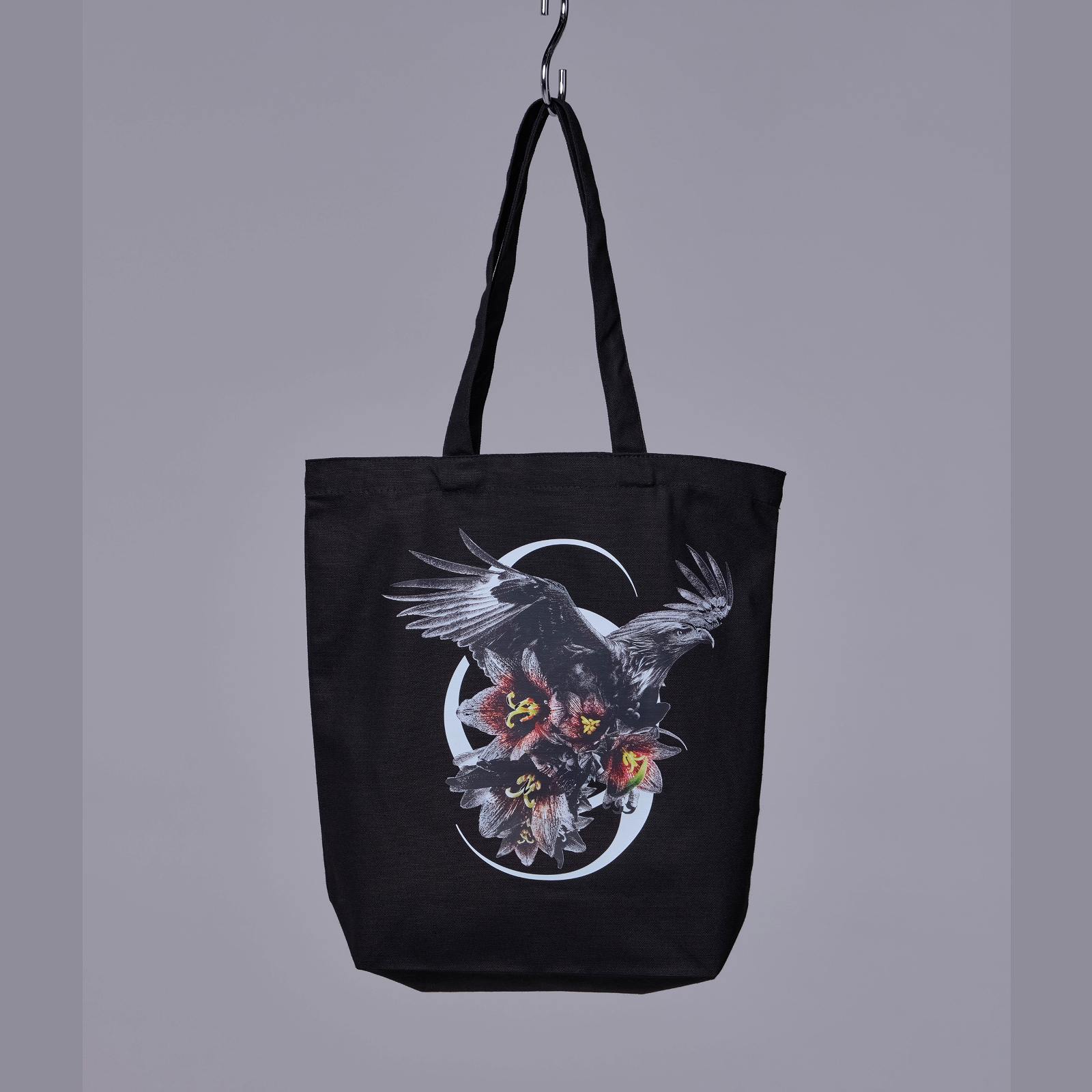 石川県を象徴する「犬鷲」と、郷土の花である「黒百合」をモチーフにしたオーガニックコットンTシャツとトートバッグです。
