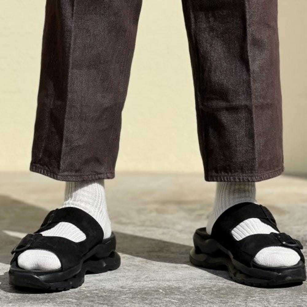 オーセンティックなデザインにボリュームソールを合わせたバランスが新鮮で、オールブラックのカラーリングと相まってどこかモードなムードを漂わせています。