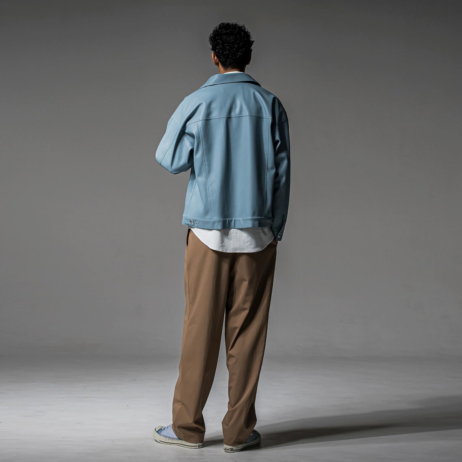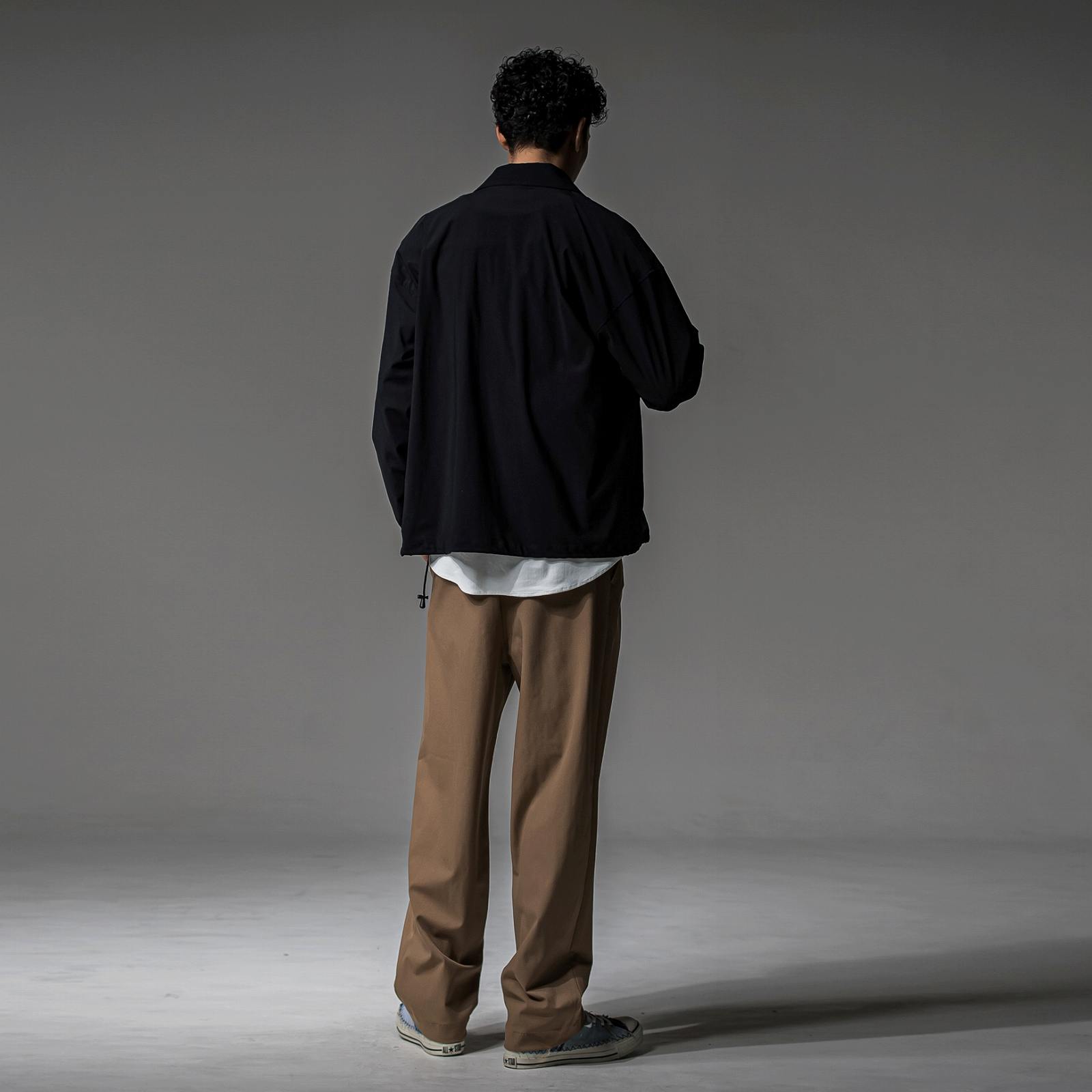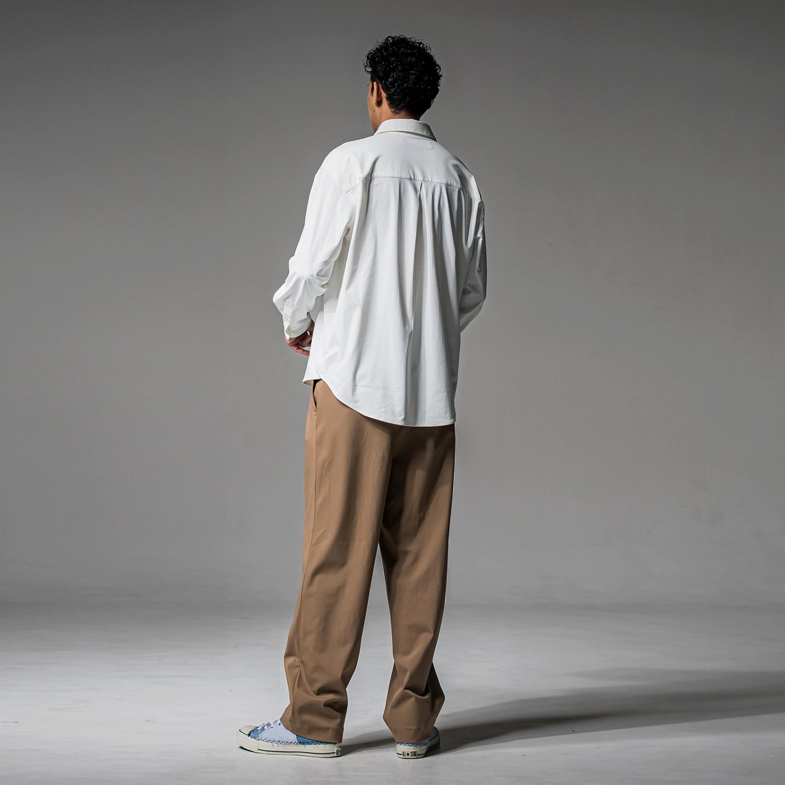 股上が深く、ゆとりのある腰回りとワタリ、ややゆるいテーパード
