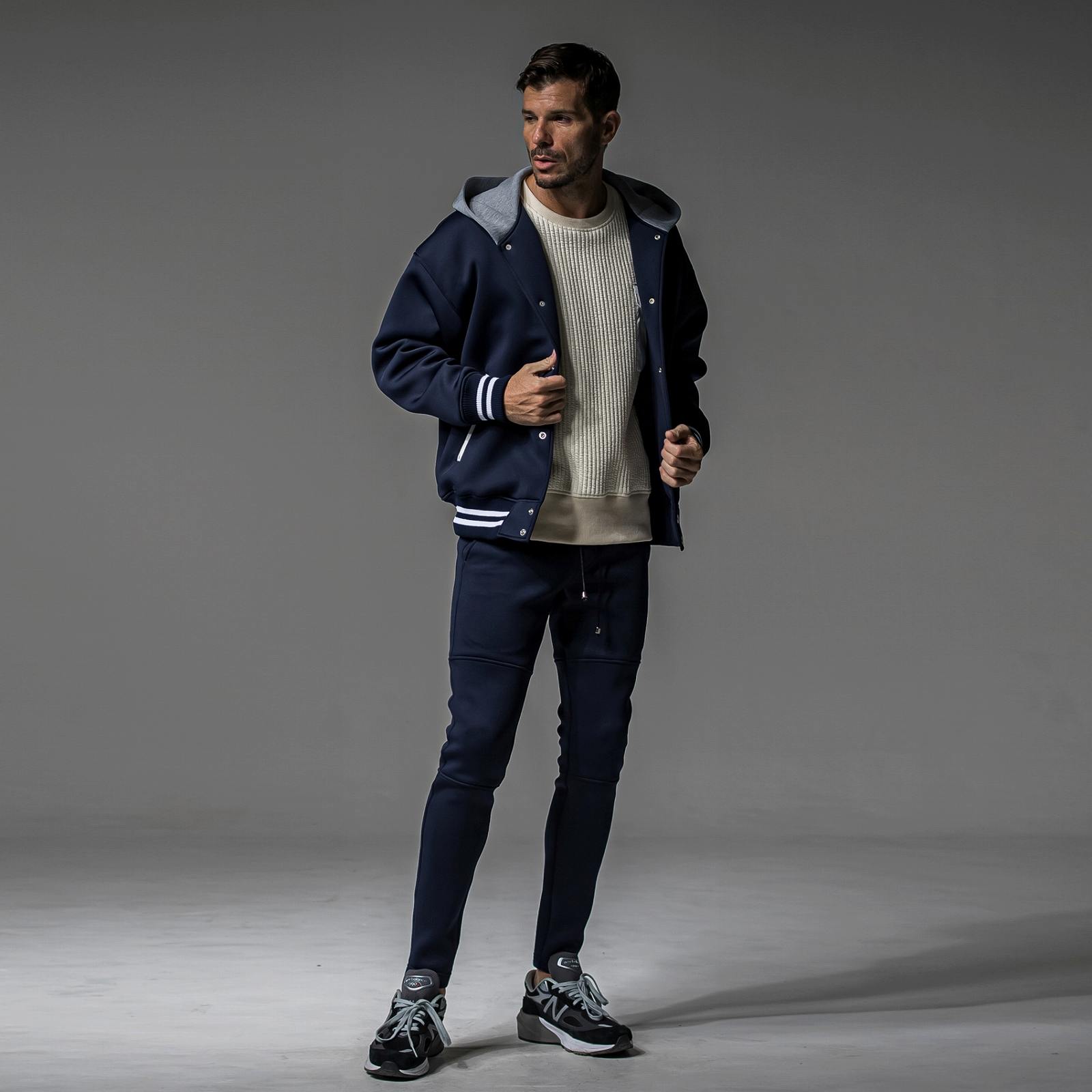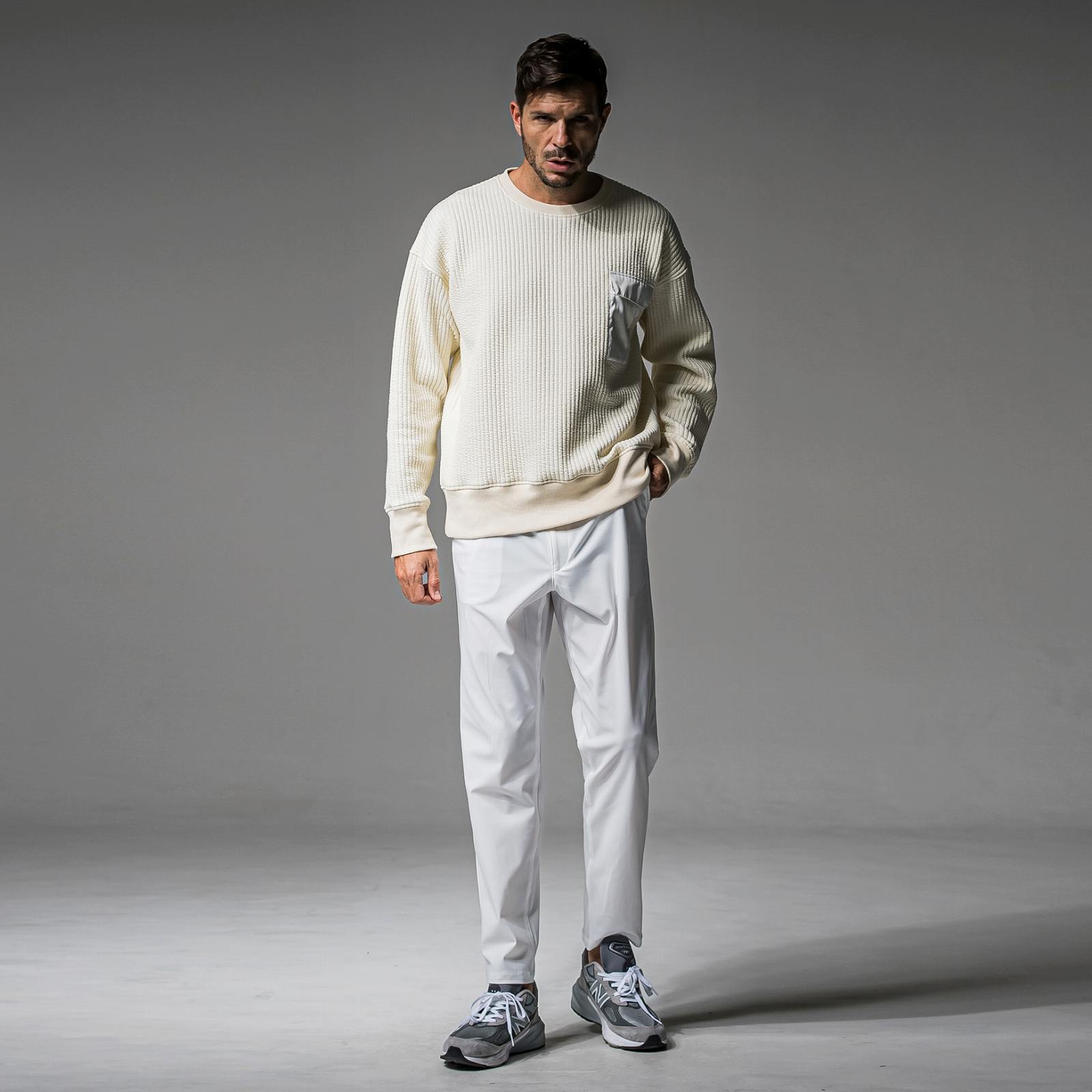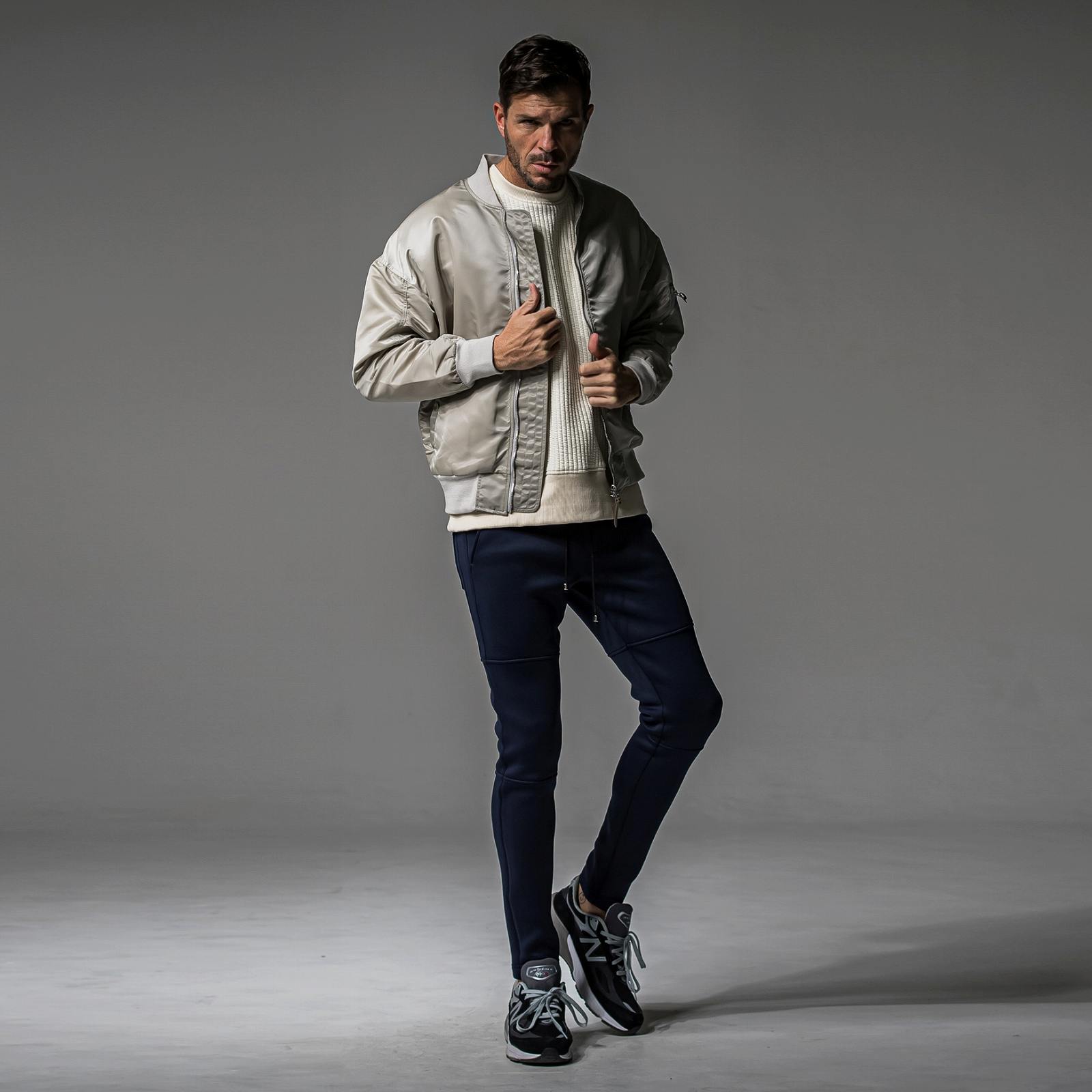 中綿を入れ、キルティングでストライプ柄を表現したストレッチスウェット