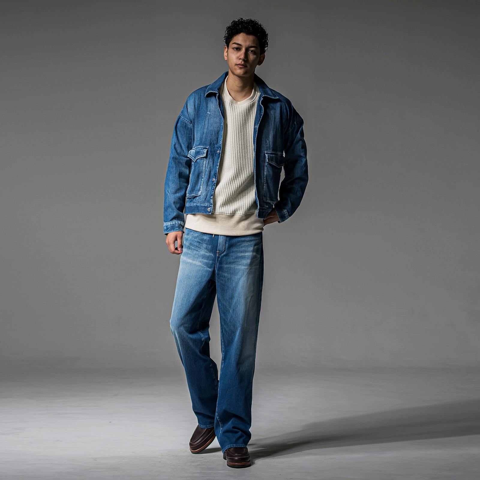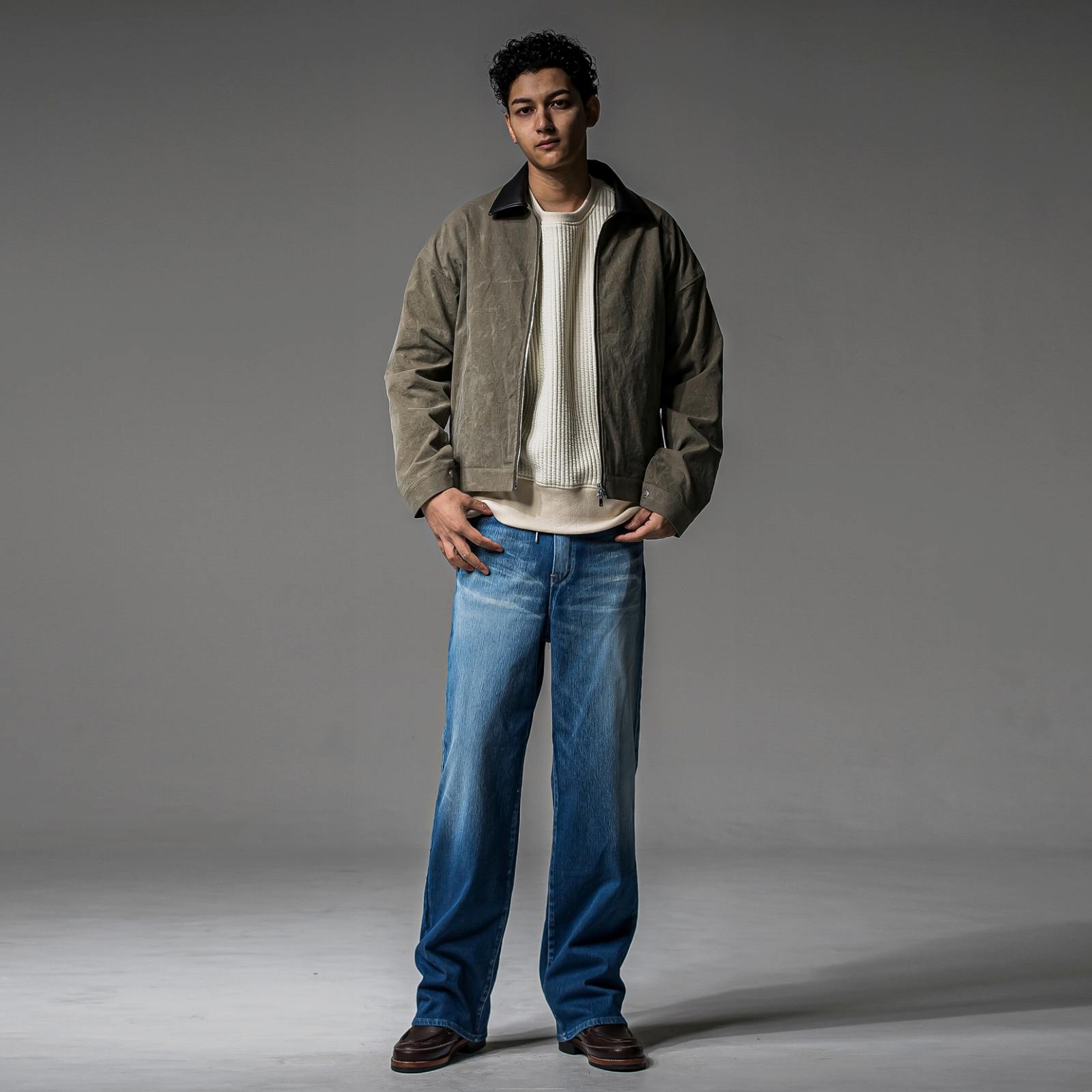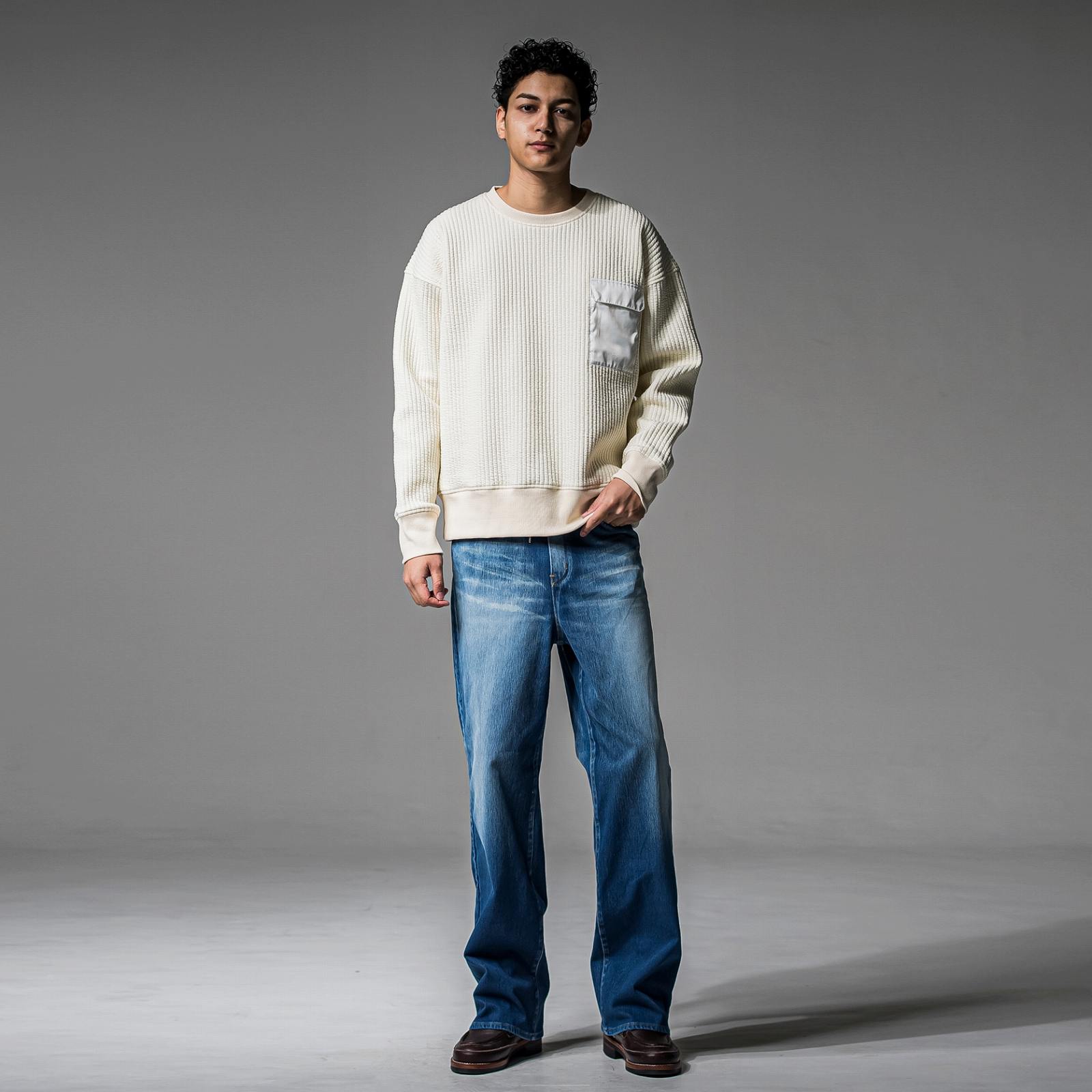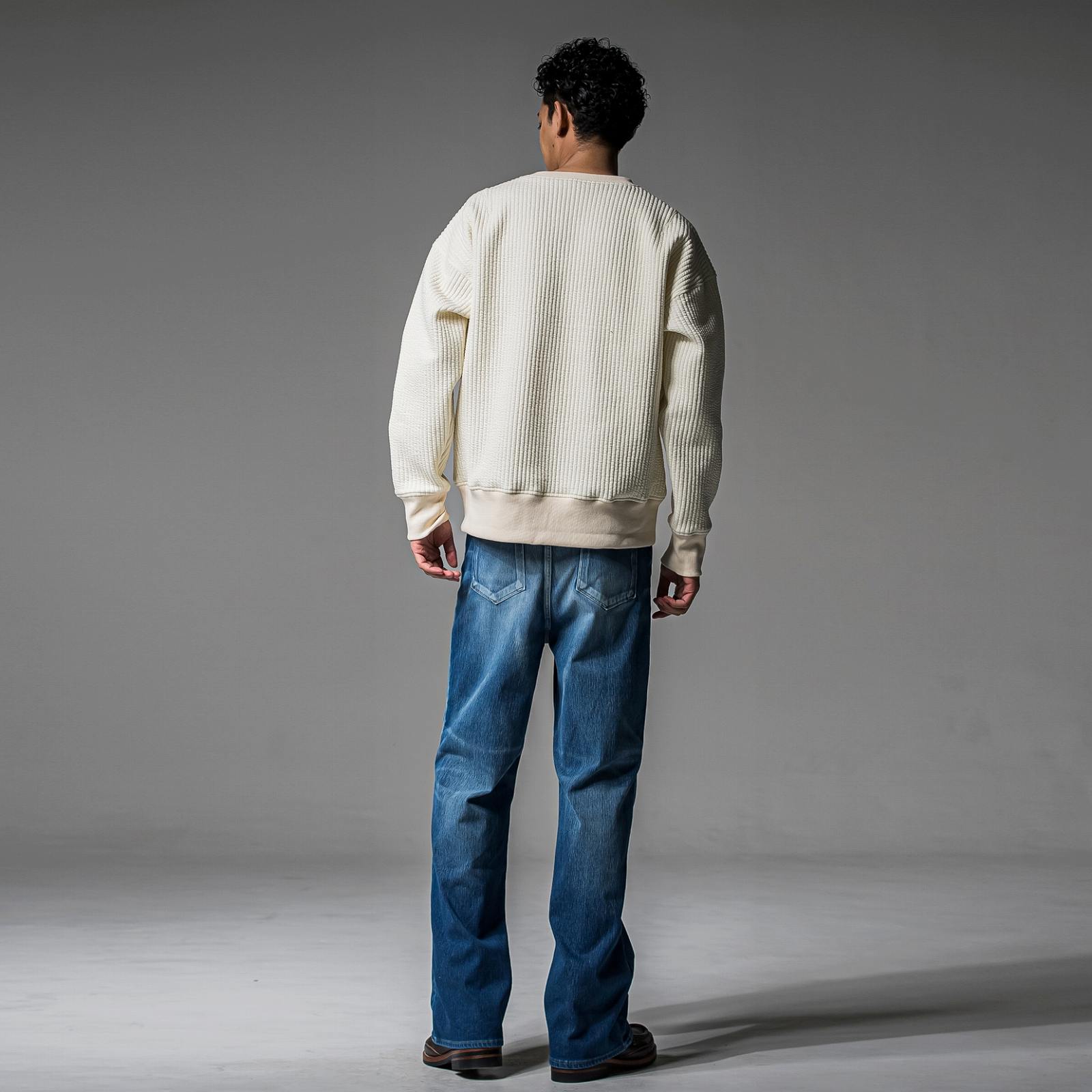 やや着丈は長く、詰まりすぎない襟、袖口、裾も同素材のリブ仕様に仕上げました。