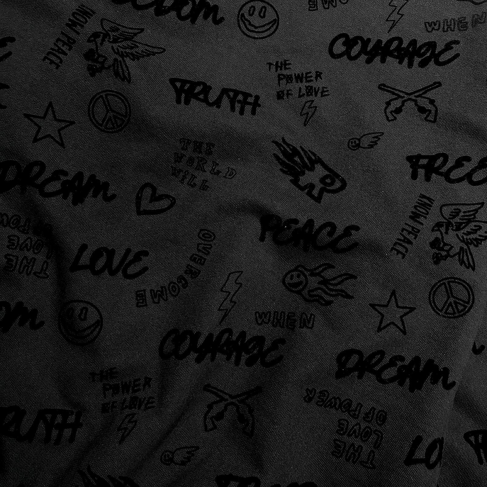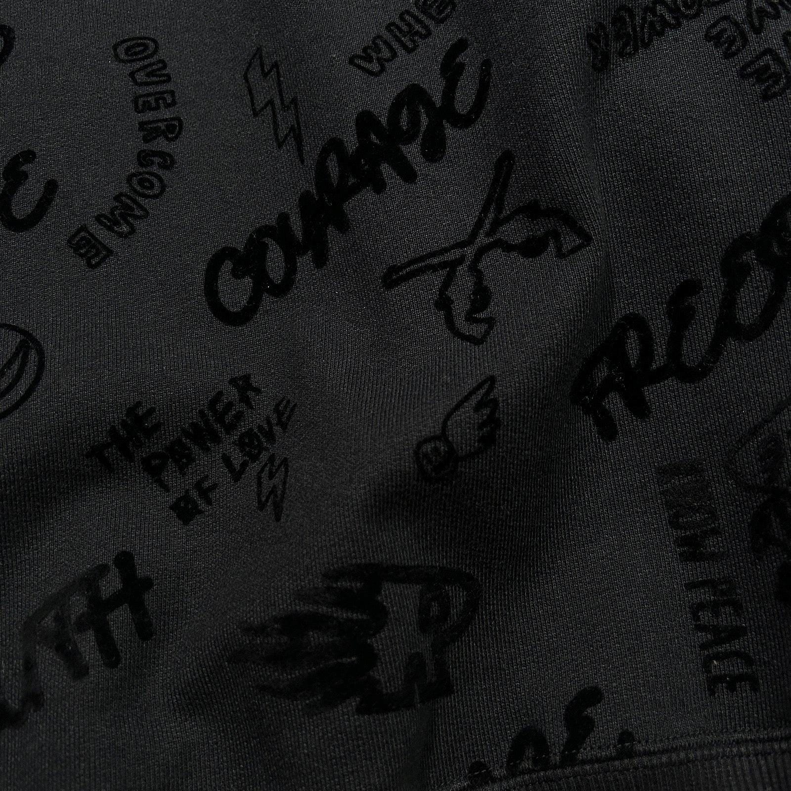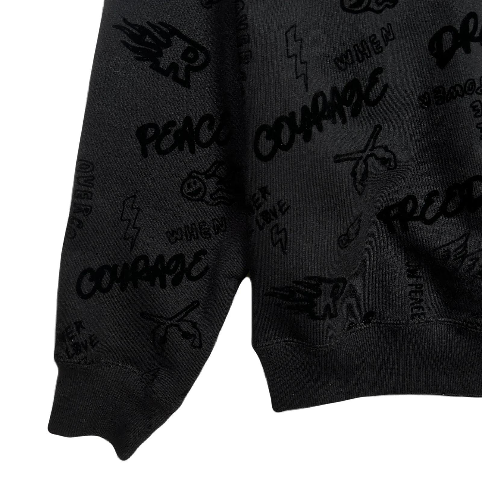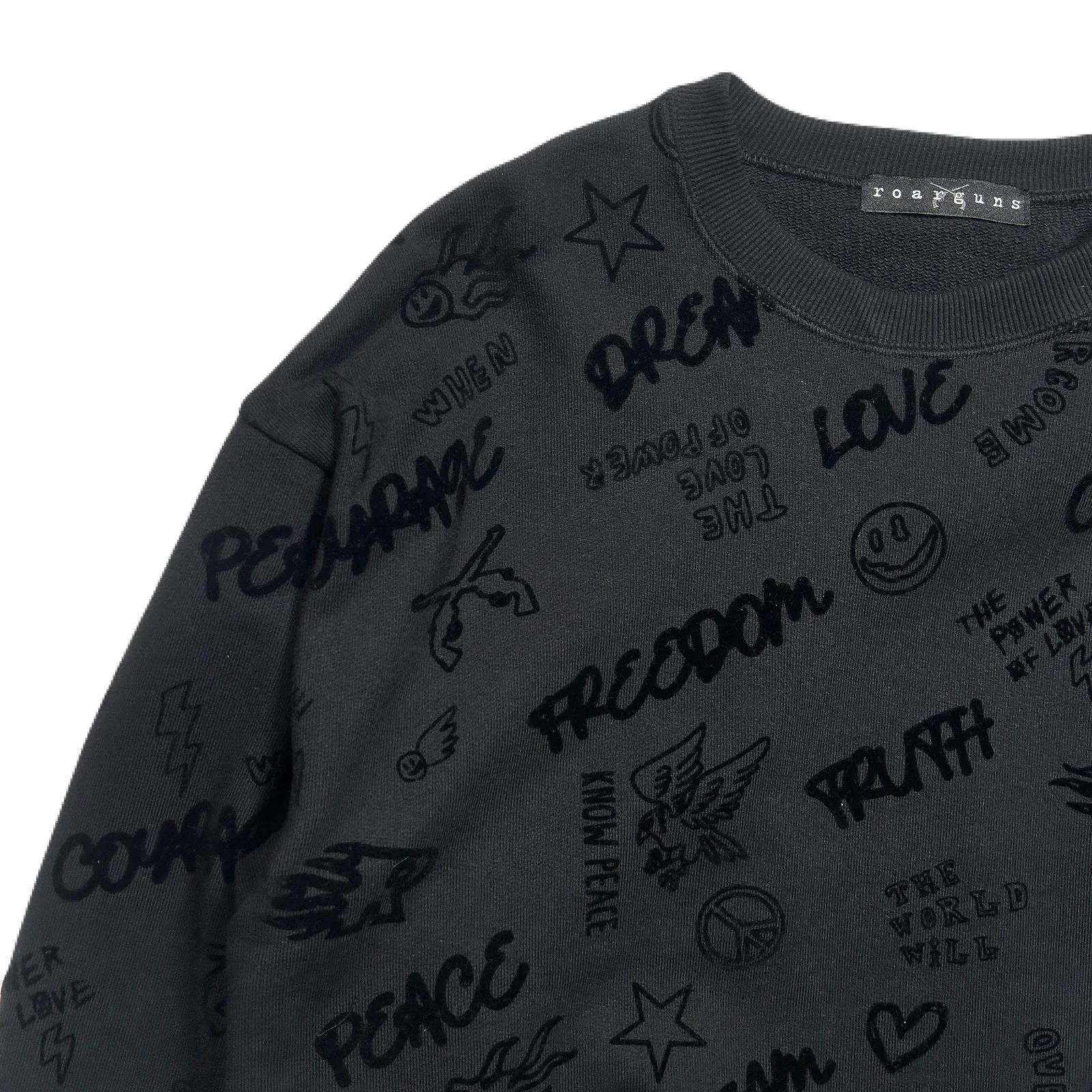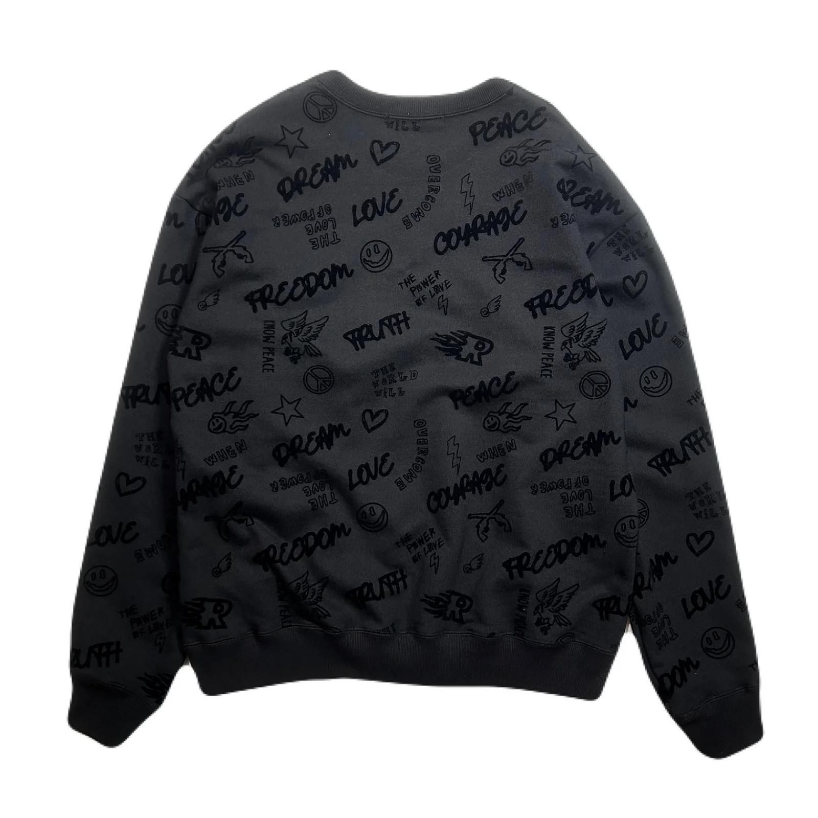 クロスガン、スマイル、イーグルなどのモチーフを全面に散りばめたフロッキープリントのスウェット。
